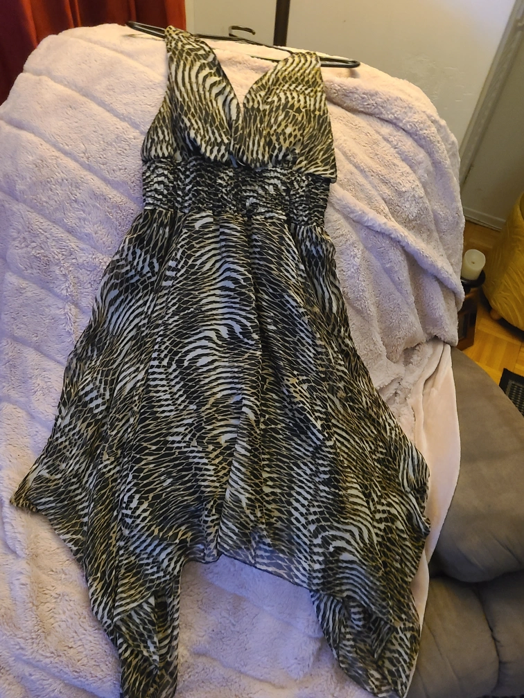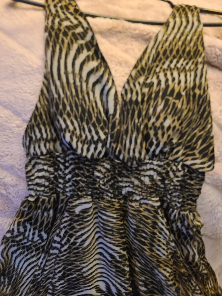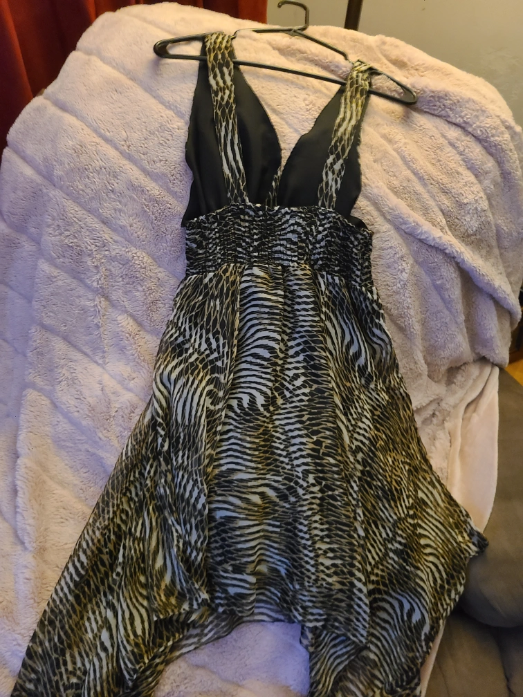 Selling a dress with an animal print design. It has a V-neck and an elastic waist. It's in great condition and ready for a new home!
