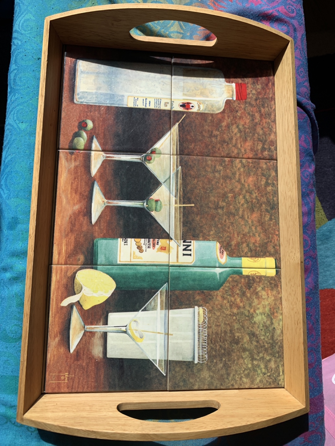 Looking to add a touch of vintage late 2000s charm to your home serving style? This wooden serving tray features a unique martini art design on ceramic tiles. It's perfect for serving drinks or snacks to your guests, or even just as a decorative piece for your home. The tray is in great condition and ready to be used!