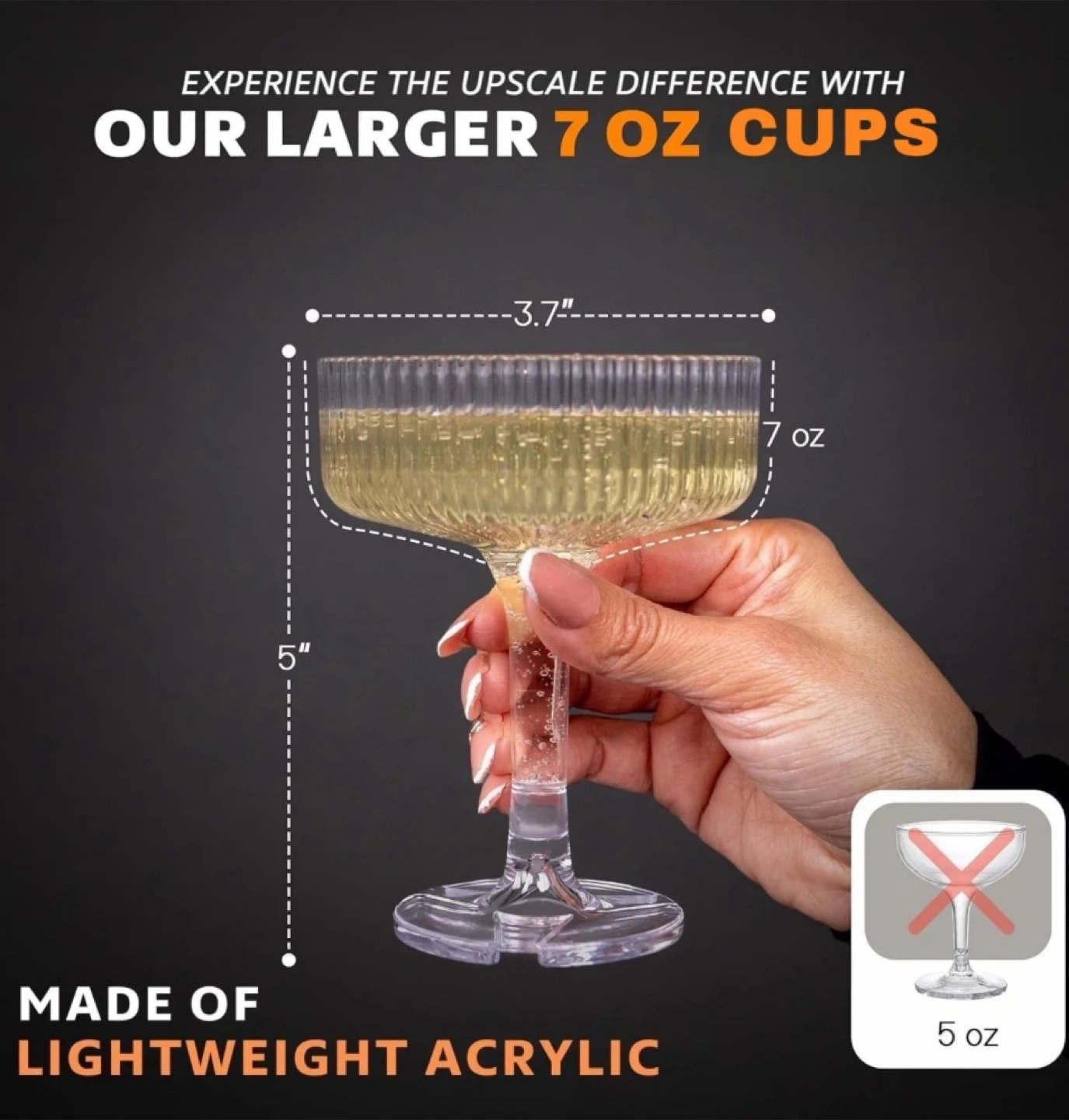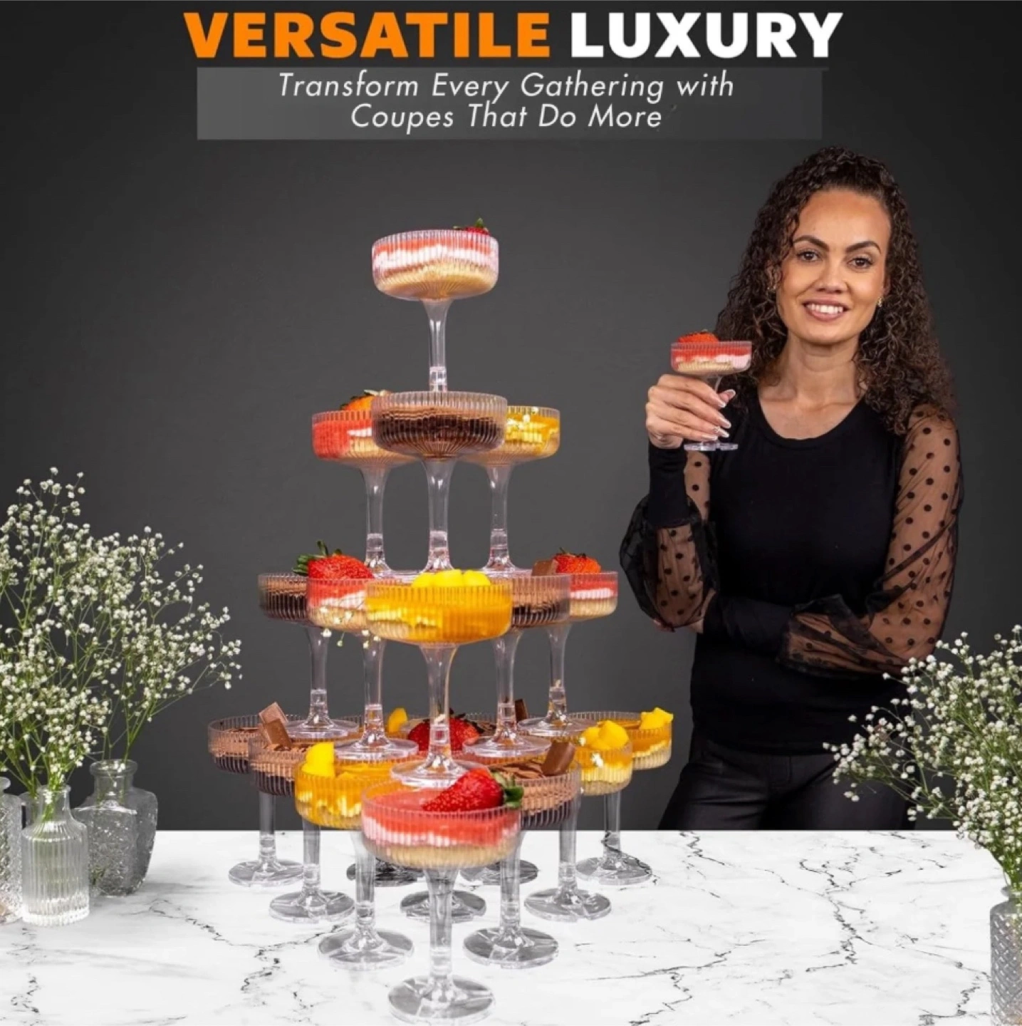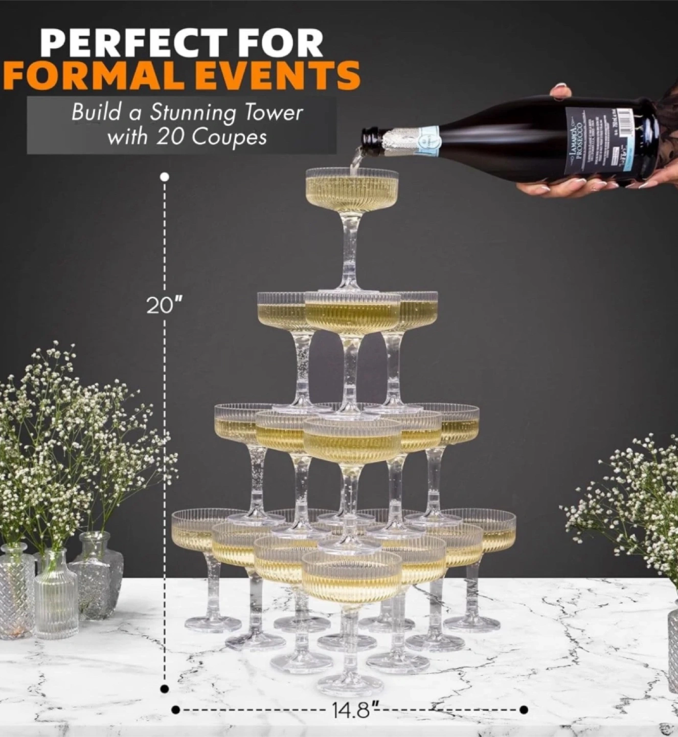 Acrylic Champagne Tower โ 19-Piece Set ๐ฅ Celebrate in style with this Art Deco champagne tower! Includes 19 reusable 7oz acrylic coupe glasses, perfect for weddings, parties, or any special occasion. Sturdy, stackable, and easy to clean โ ideal for champagne, martinis, or desserts. ๐ฆ Brand new, safely packaged.