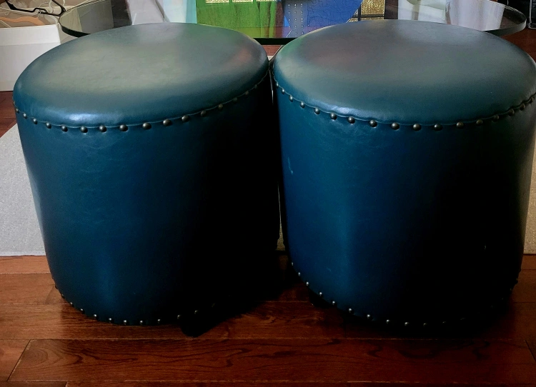 *Moving* Selling a pair of teal faux leather ottomans for $30 for set. They are in good shape and would make a nice addition to any living room or bedroom. The ottomans are round and have a studded design around the top and bottom. They are perfect for resting your feet or as extra seating. Could even work for a cottage setting as well.