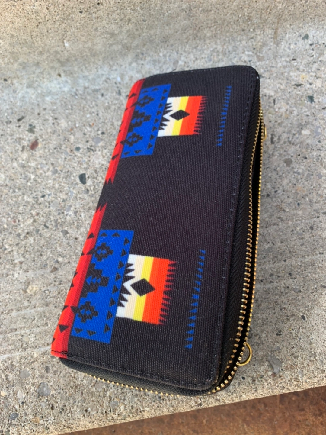 Selling a wallet with a unique pattern. It's black with colourful accents and has a zippered closure. Brand new and ready for a new home…has a strap inside to convert it into a purse!!! Nine inches length by 3.5 inches wide…