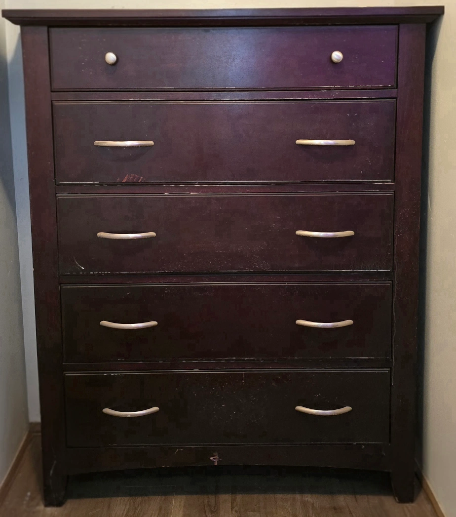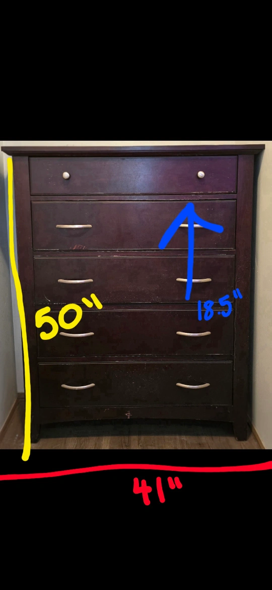 Selling a dark brown 5-drawer dresser. It's 50 inches tall, 41 inches wide, and 18.5 inches deep. It has some scratches and such, but it's still in great condition and ready for a new home. Real Wood - can get a stain for touch-ups or can be used for refinishing easily. PICKUP ONLY in Erinwoods. No delivery available.