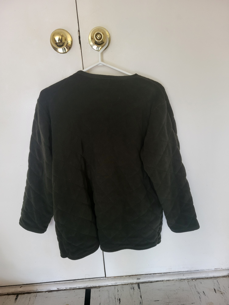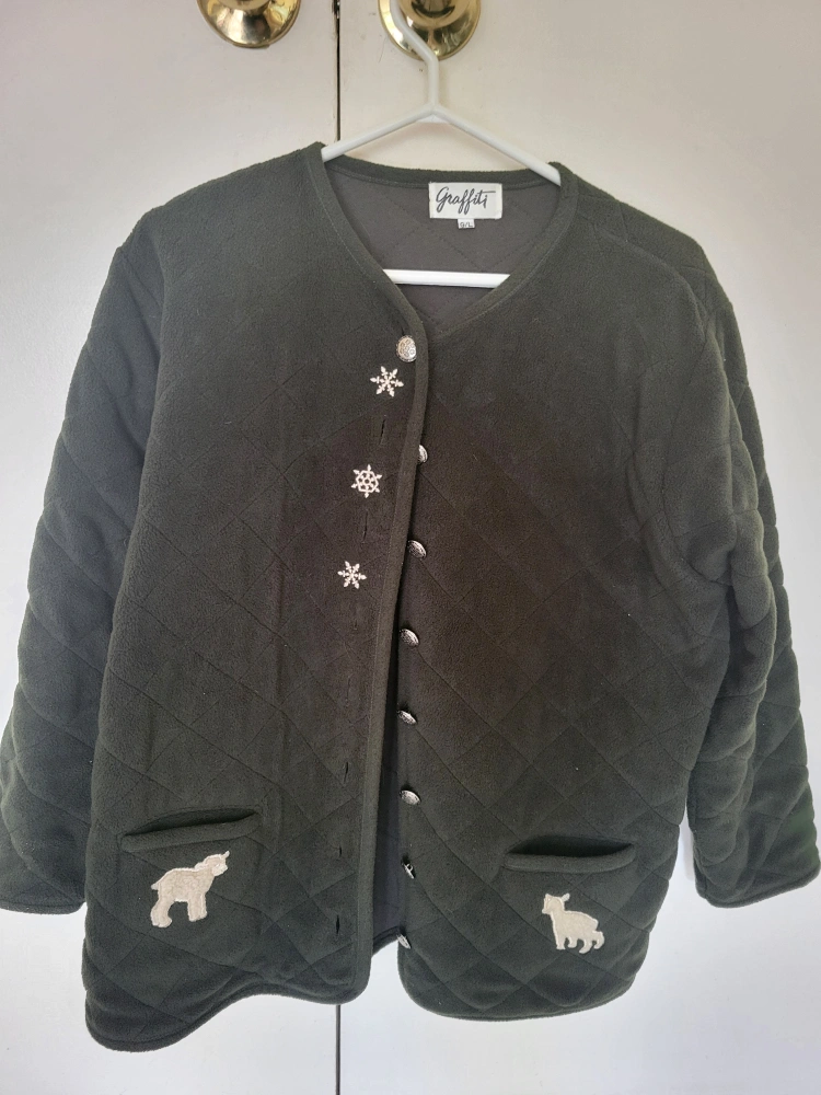 Cozy Graffiti quilted fleece jacket in a lovely dark green colour. It has cute little sheep appliques on the pockets and snowflake buttons. Size large.
