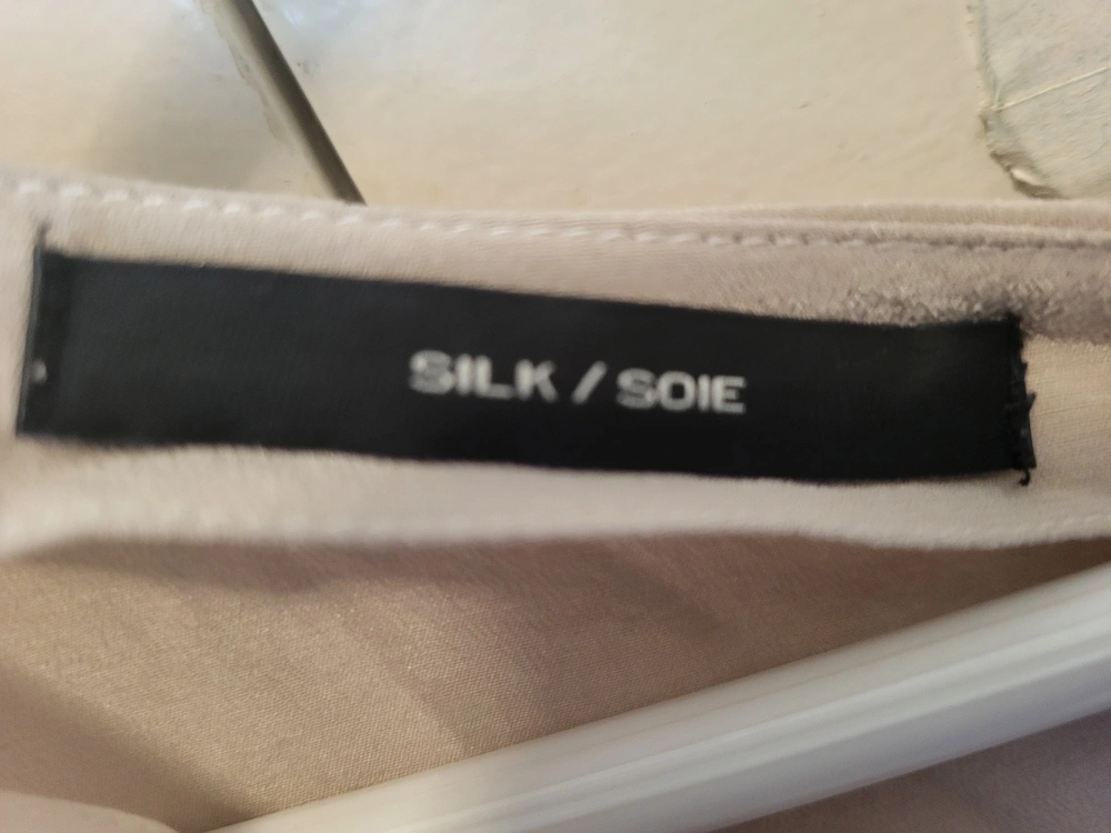 This is a MEXX Metropolitan silk top in a colour block design with beige, cream, and coral. It's a European size 42, which is equivalent to a Canadian size 12. It has a button-down back and short sleeves. Perfect for a casual or work outfit!