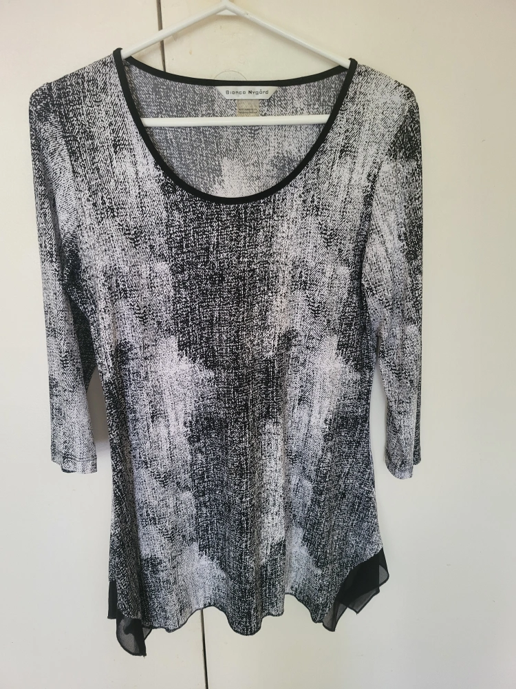 I'm selling a Bianca Nygård blouse. It is size small and has a unique black and white pattern. It's in great condition and ready for a new home!