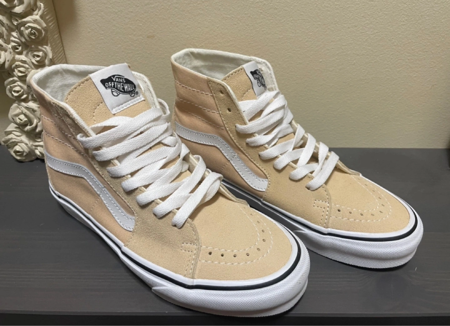 Upper is a leather/canvas mix with standard vans rubber soles. Colour: Honey Peach - a beautiful and very versatile neutral tone for spring, summer and fall!