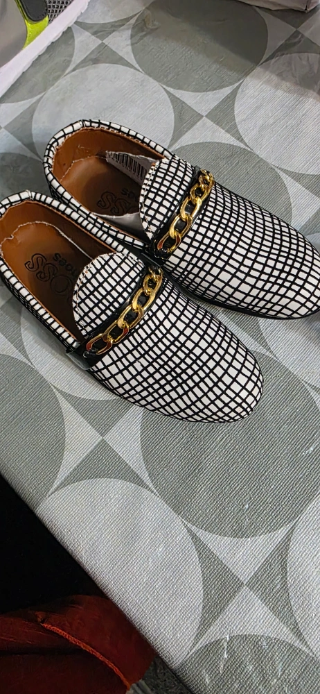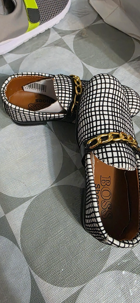 These adorable BOSS shoes feature a stylish black and white checkered pattern with a gold-tone chain detail. They're perfect for dressing up any outfit! The shoes appear to be in great condition and ready for a new home
