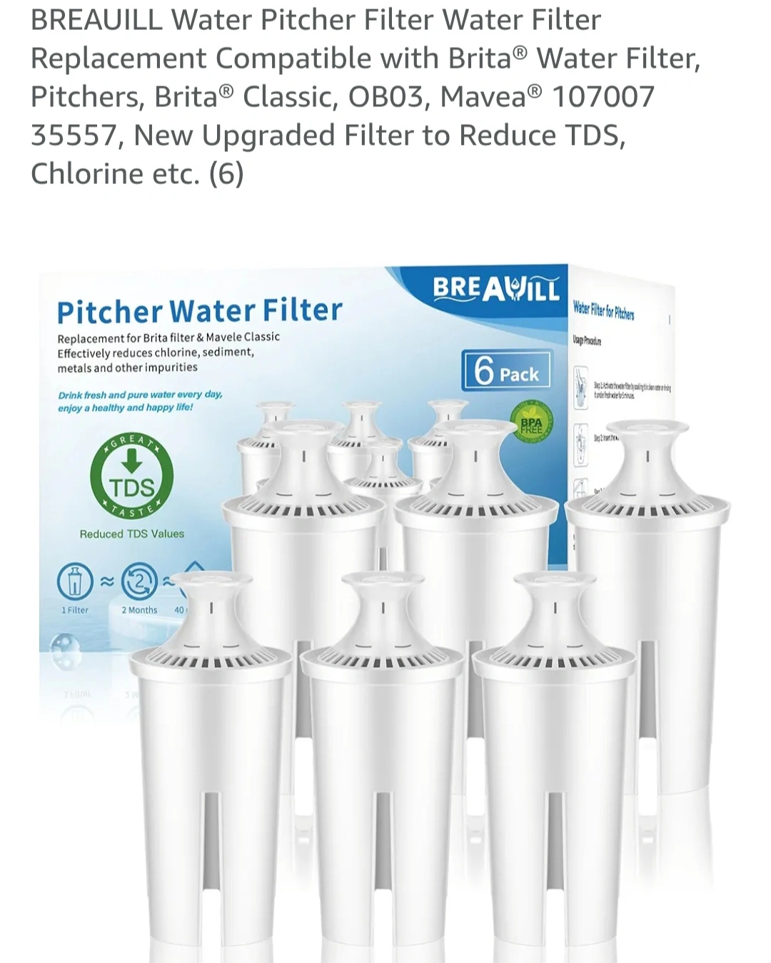 I'm selling a pack of BREAUILL water pitcher filters. These filters are compatible with Brita and Mavea Classic pitchers. They effectively reduce chlorine, sediment, metals, and other impurities, ensuring you enjoy fresh and healthy water. The pack includes 6 filters, and they're simple to install, providing a natural fit with no leakage