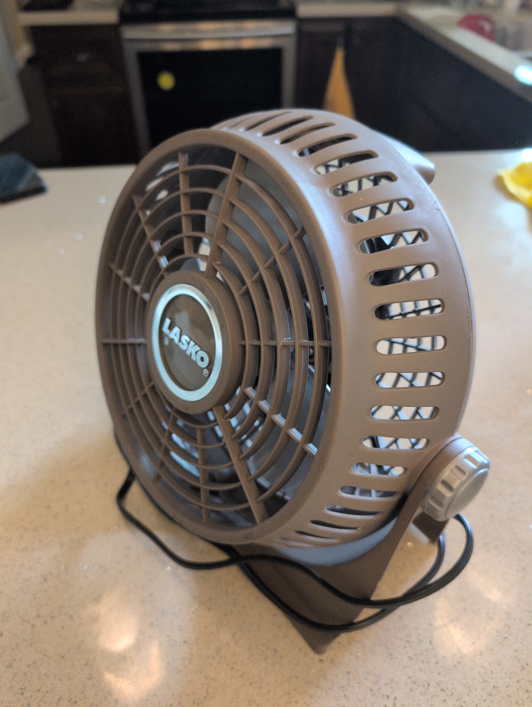 Selling a Lasko tabletop fan in brown. It's in great condition and perfect for keeping cool on your desk or nightstand. It's lightweight and portable, so you can easily move it around as needed