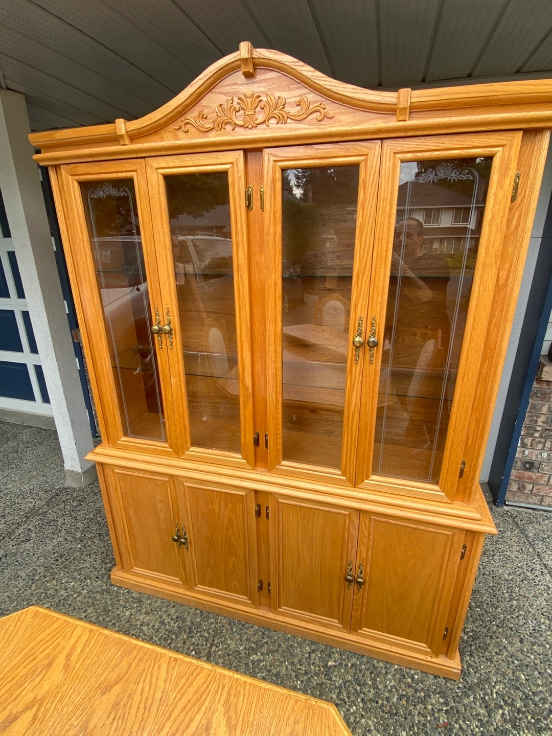 A beautiful wooden china cabinet with glass doors. It has a classic design and is perfect for displaying your favourite dishes or collectibles. It features intricate detailing and offers ample storage space. This is a 2-piece unit, lower(L-62”X W-14.75” X H-29.5”) & Upper(L-58.5”X W-14”X H-46.5”)