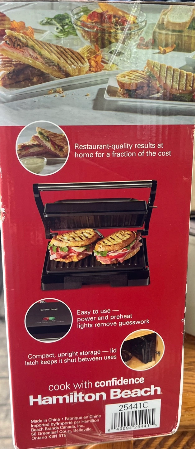 58I'm selling a Hamilton Beach Panini Press & Compact Grill! It makes paninis, hot sandwiches, and more on this 2 in 1 panini press and grill. It features: - Floating lid evenly presses food of varied thickness - Easy cleanup with nonstick plates and dishwasher safe drip tray - Easy to use power and preheat lights remove guesswork - Compact, upright storage – lid latch keeps it shut between uses