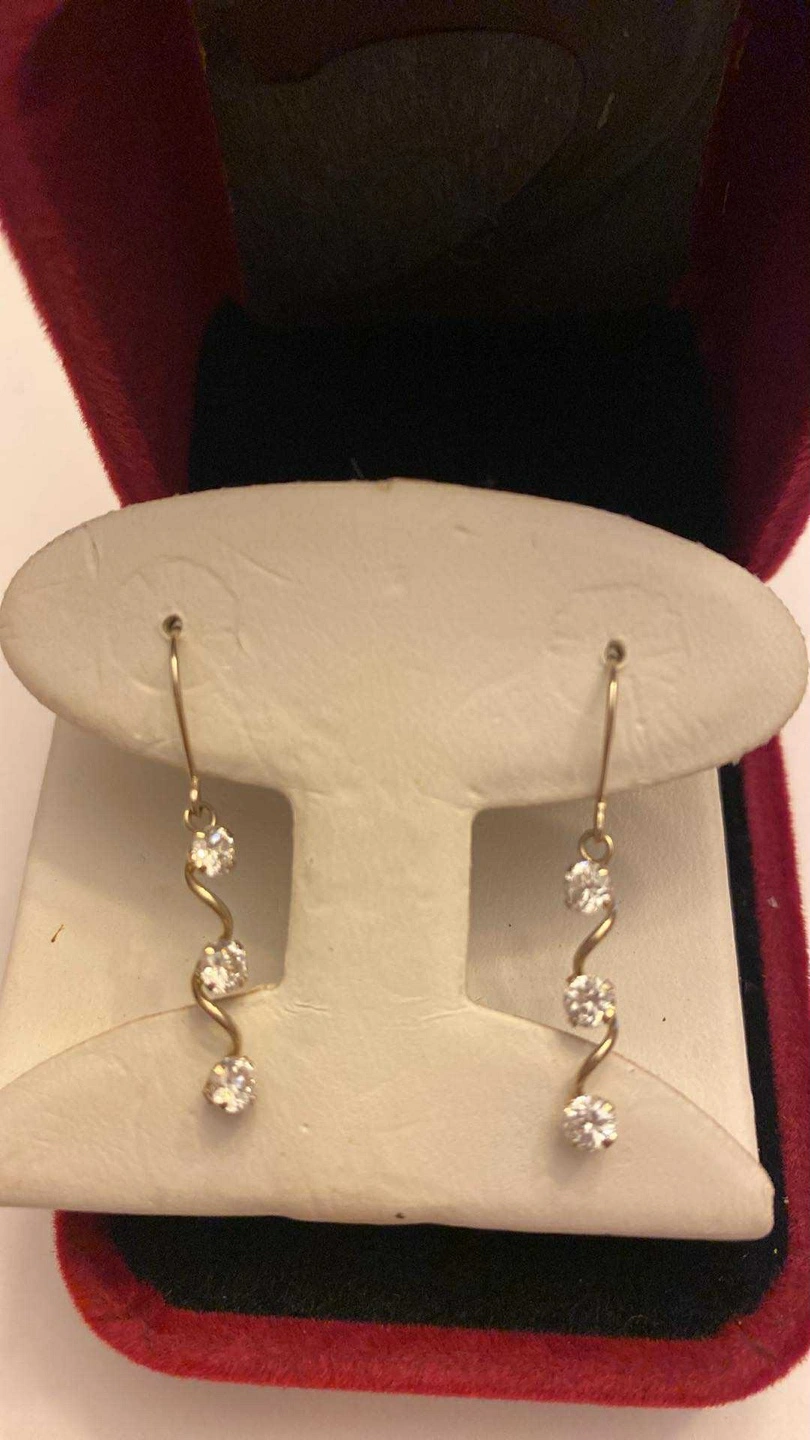 96Selling a pair of elegant dangling earrings. They feature a gold-tone wire with three cubic zirconia stones on each earring. 10k yellow gold earrings with cubic zirconia