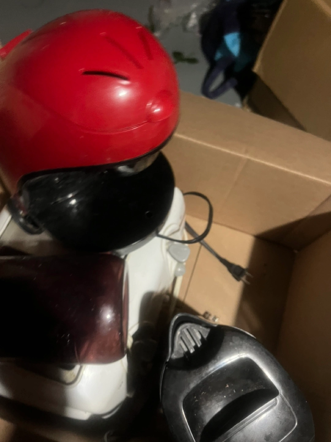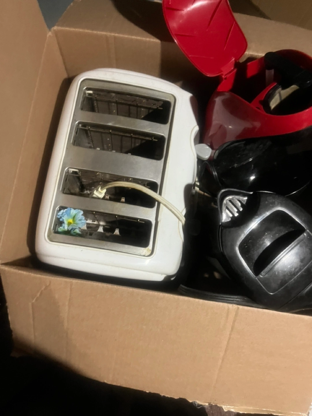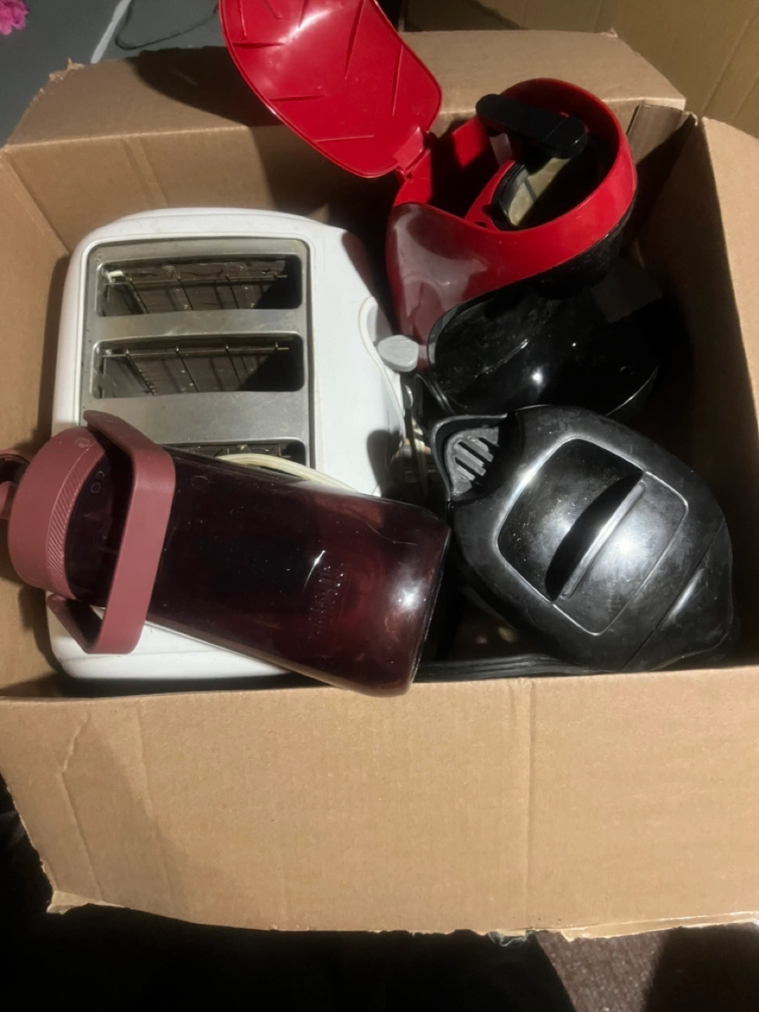 I have a box of mixed kitchen appliances. The box includes a toaster, a blender, and a water bottle. All items are in used condition.