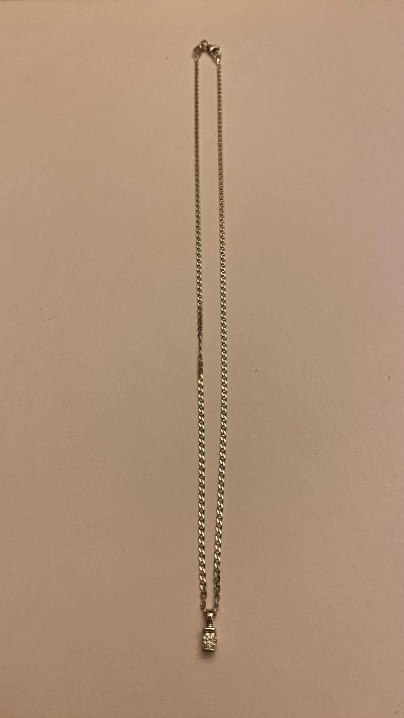 96Here's a lovely silver necklace featuring a diamond pendant. 16” white gold 14k with diamond pendant.15pts diamond