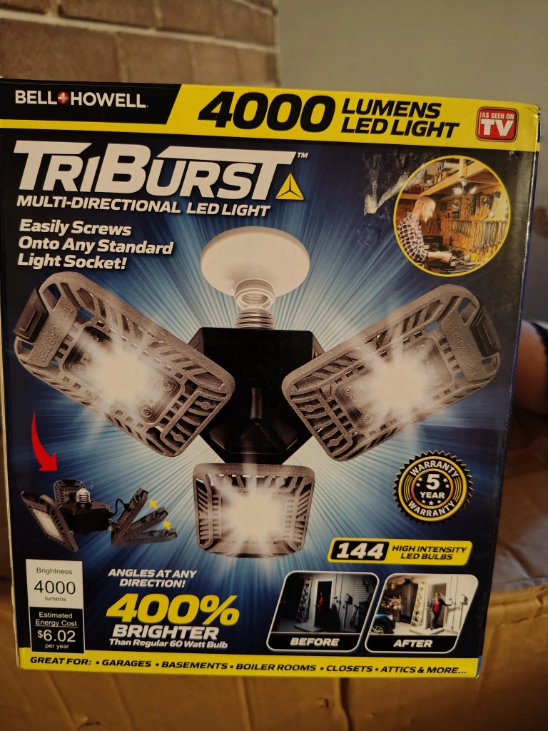 I'm selling a Bell+Howell TriBurst multi-directional LED light. It's 400% brighter than a regular 60-watt bulb! It easily screws onto any standard light socket. Great for garages, basements, boiler rooms, closets, attics and more! It also has a 5-year warranty.