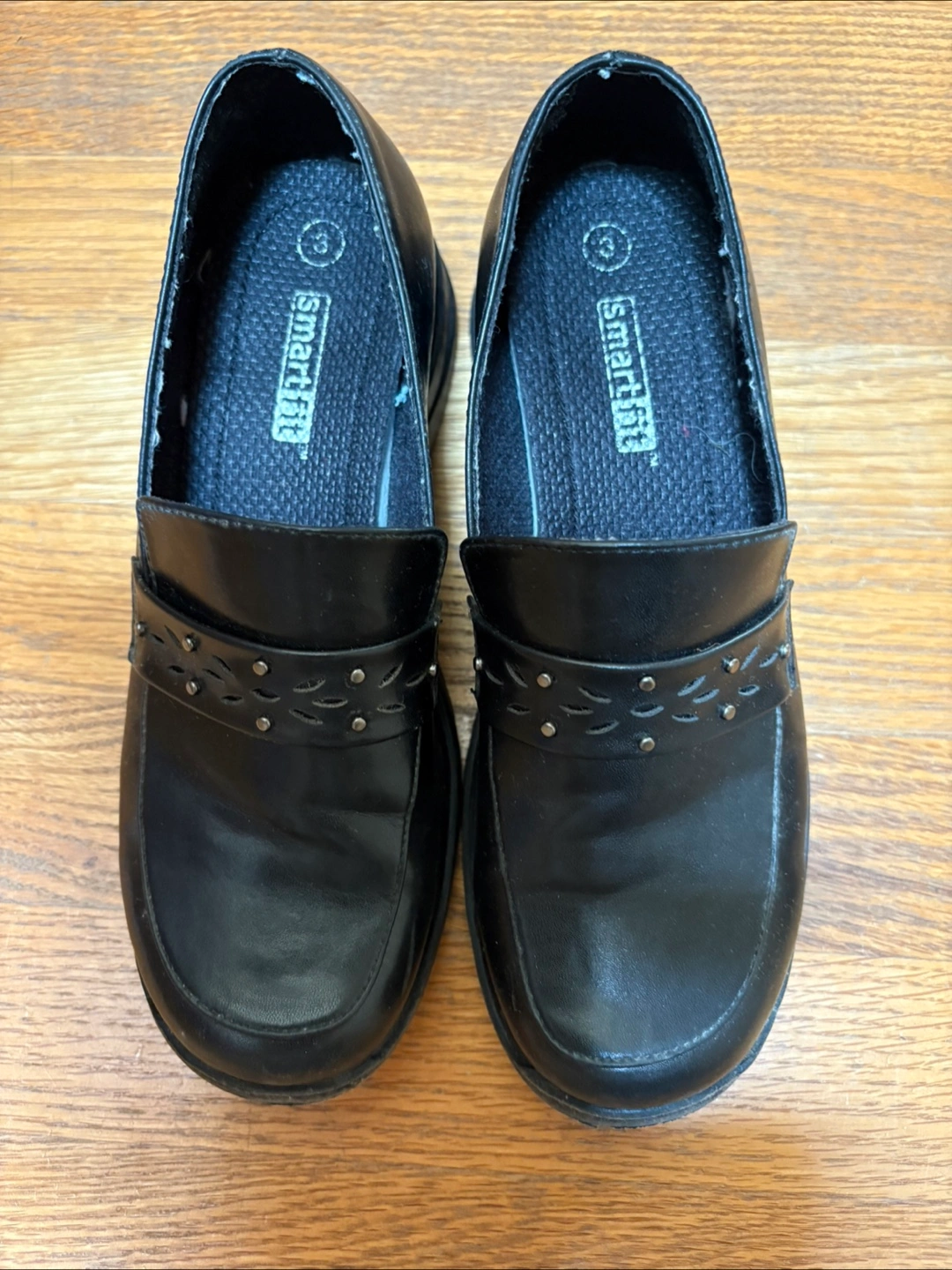 Selling a pair of Smartfit black loafer shoes in size 3. They're in good condition and are skid resistant. These shoes feature a classic loafer style with a decorative strap and subtle stud detailing. Perfect for everyday wear.