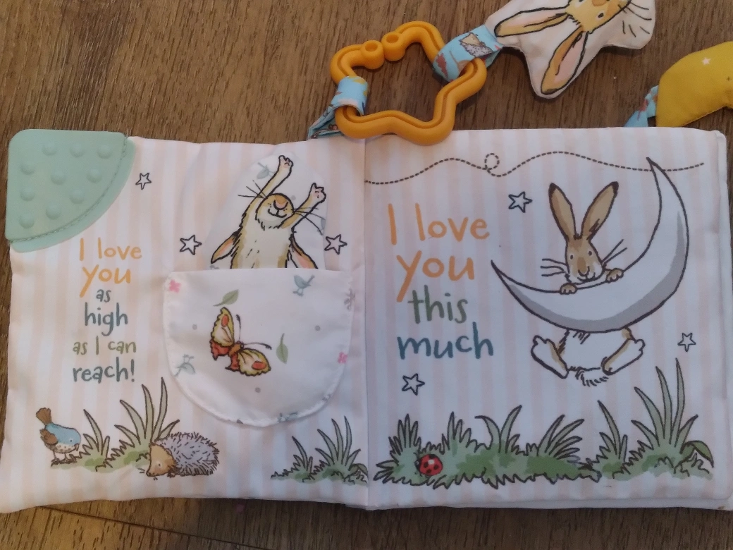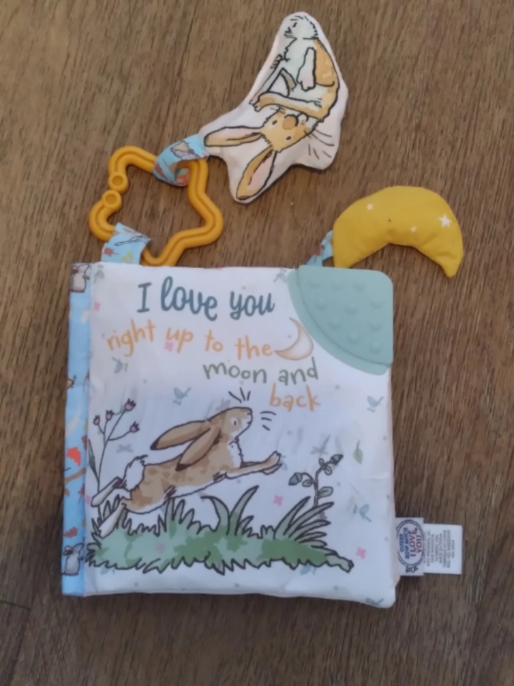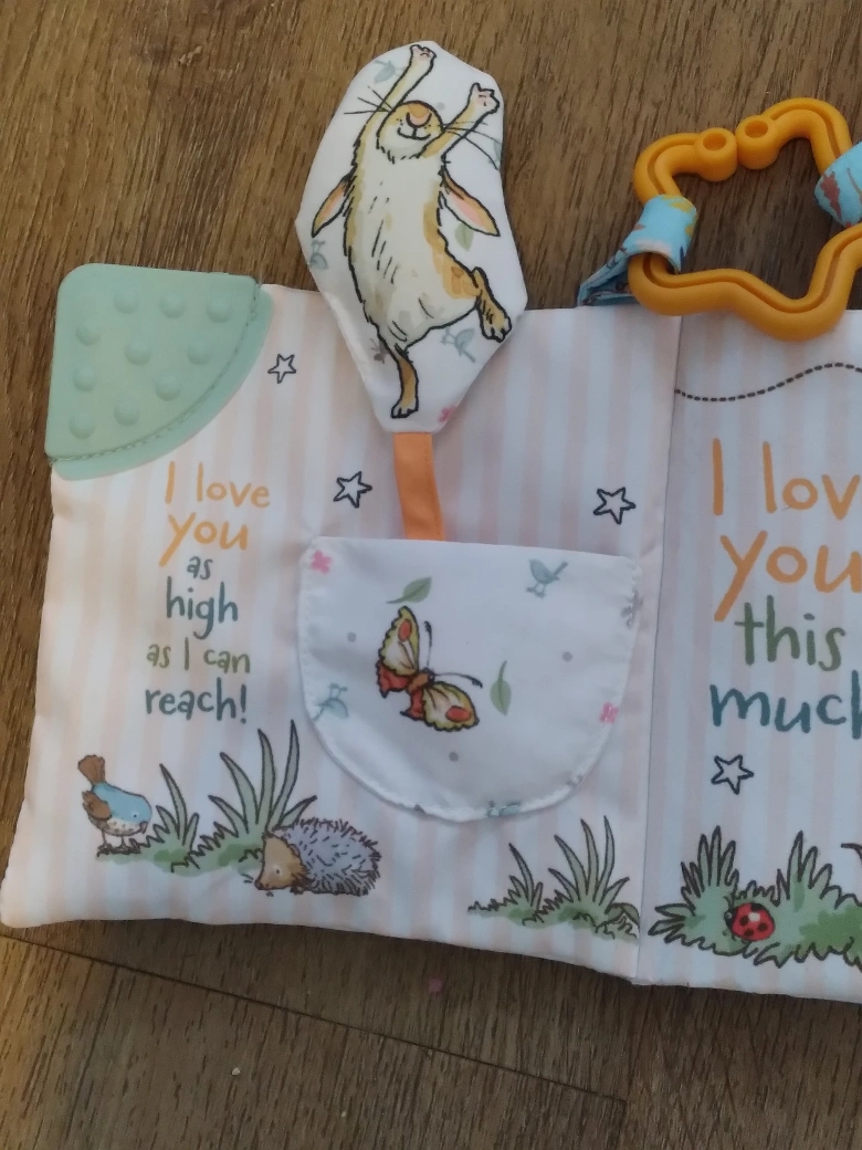 Soft, interactive book with different textures and elements for baby to explore. Perfect for tummy time or on-the-go fun! It has a teether and crinkling pages.