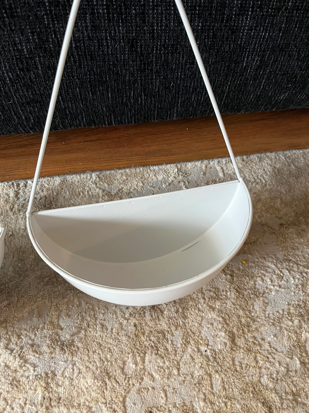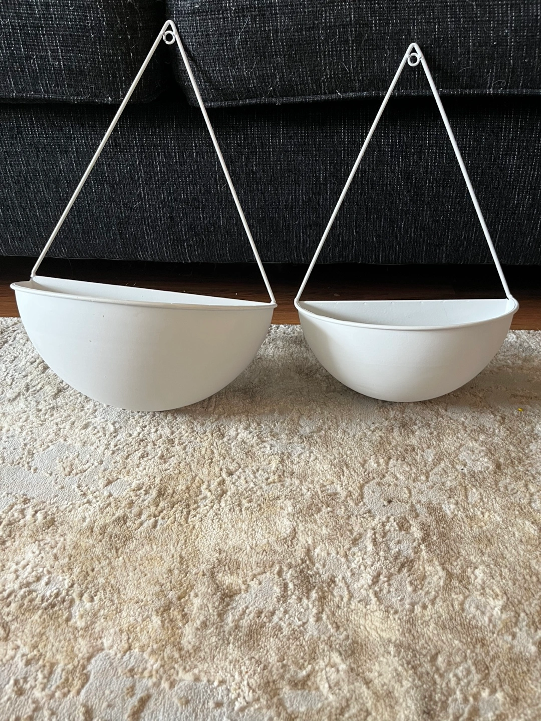 Selling a set of two white metal hanging planters. They have a simple, modern design that would look great indoors or on a balcony. They are in good condition and ready to add some greenery or wall storage to your space!