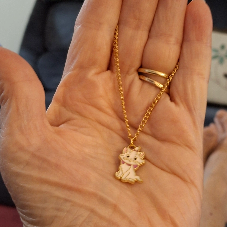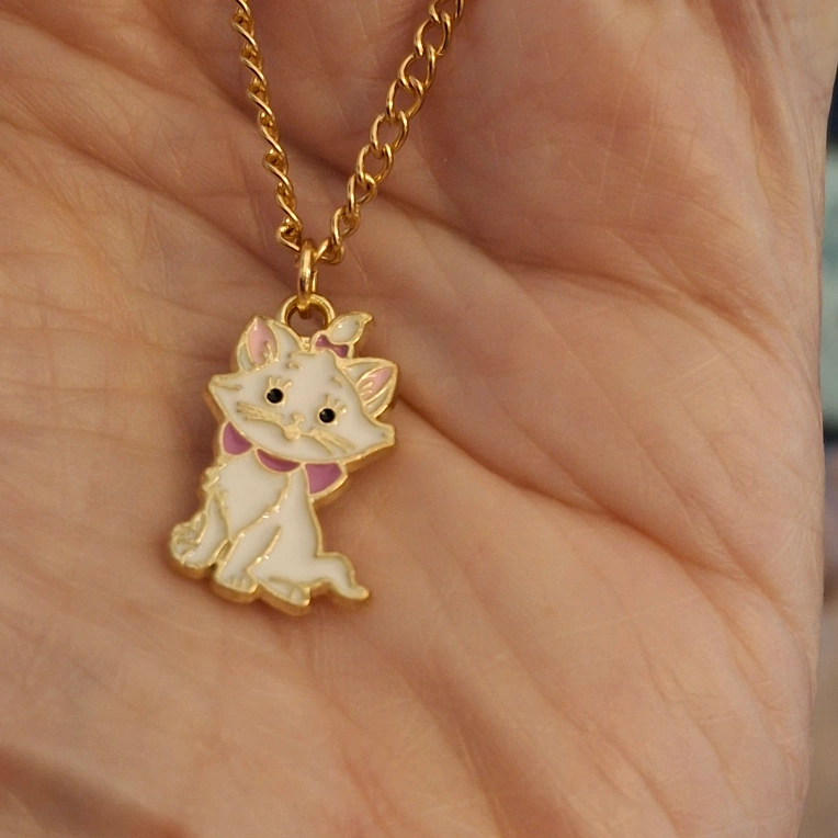 A beautiful gold necklace featuring Marie from the Disney movie Aristocats! The pendant is white with pink accents. Perfect for any Disney fan!