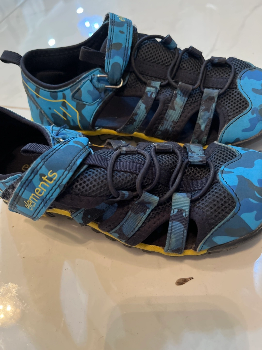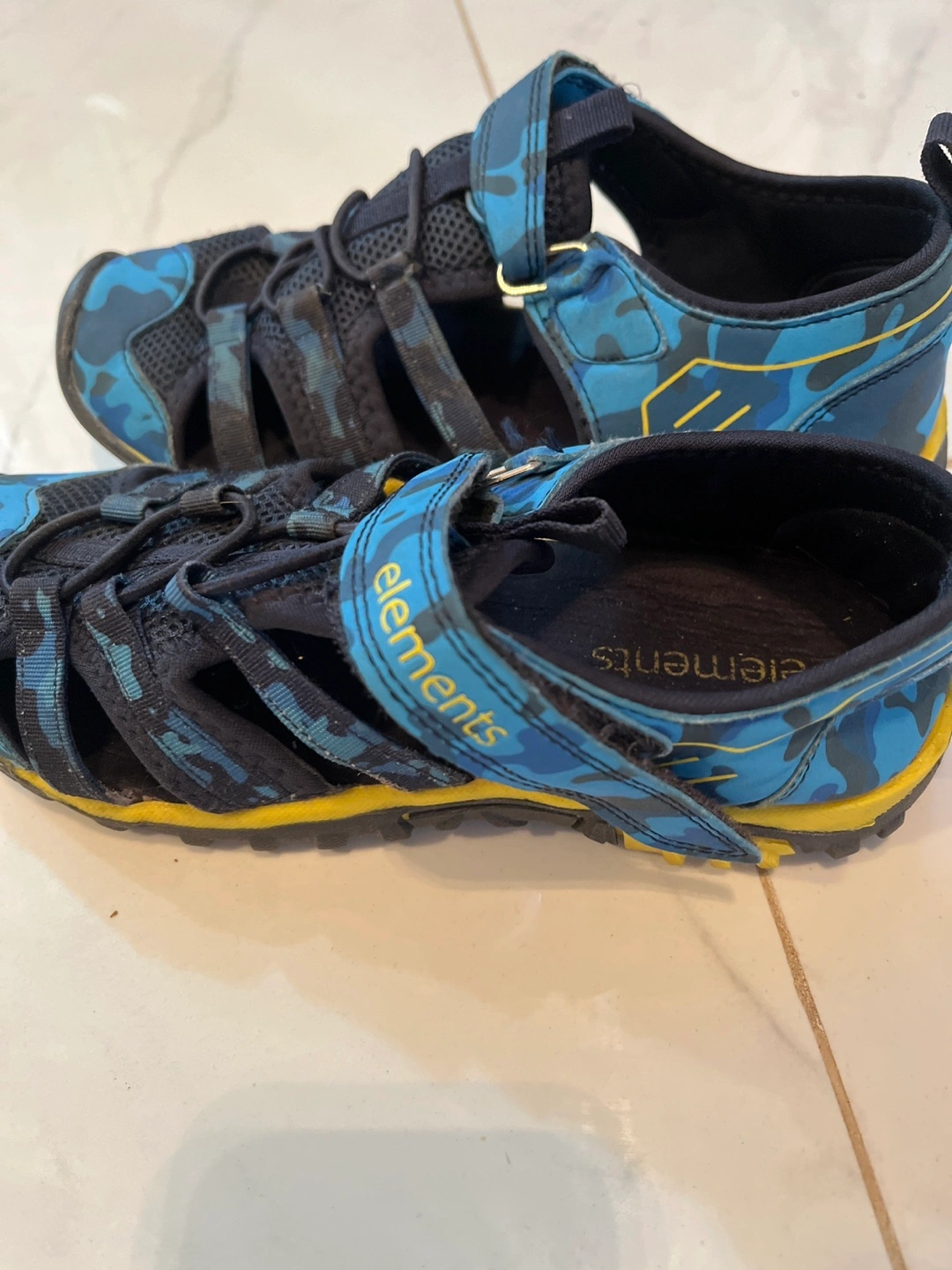 These Elements sandals are perfect for your son! They feature a cool blue camo design with black accents and a yellow sole. They're in good condition and ready for new adventures. Size 3, from smoke pet free home