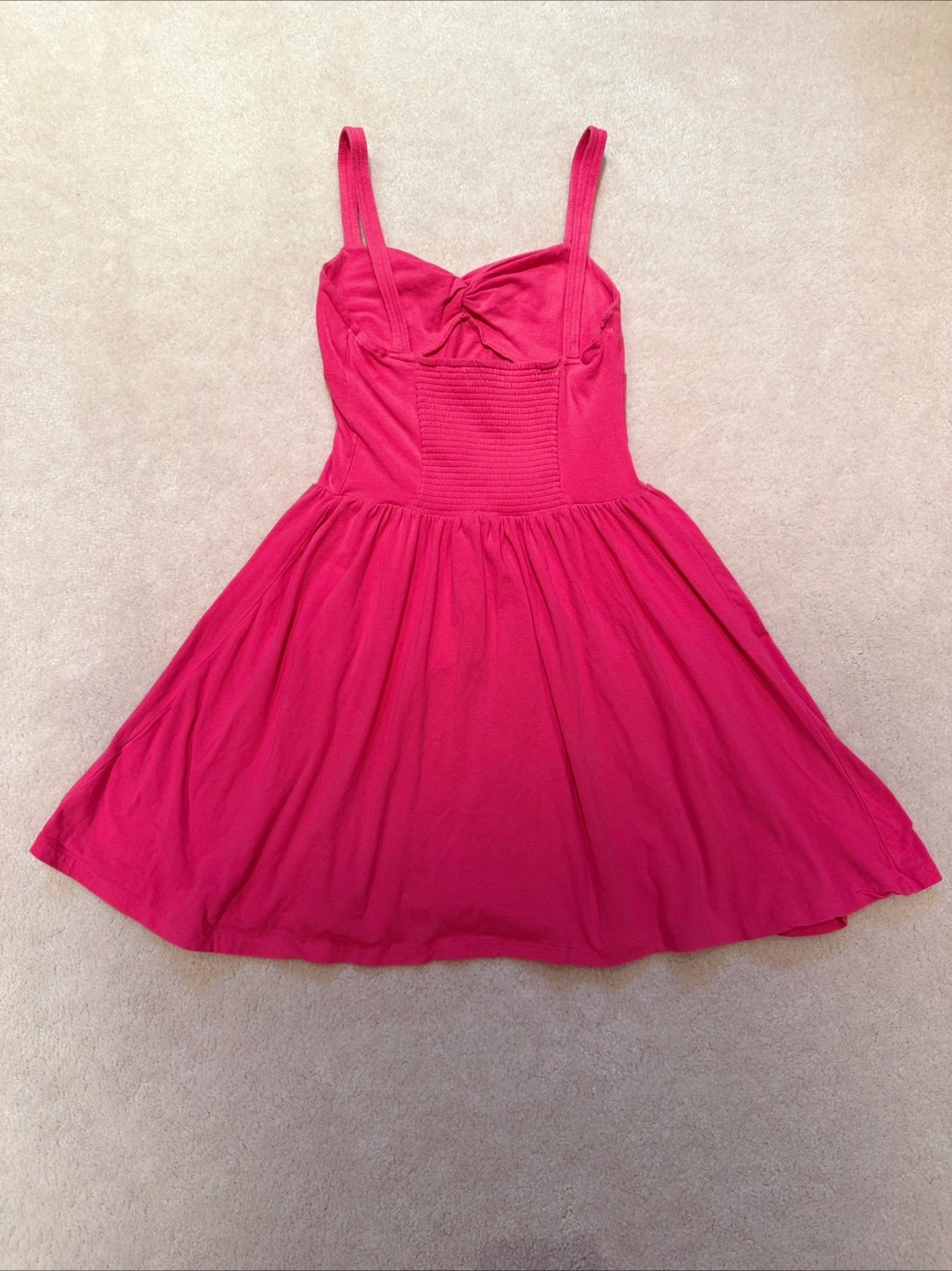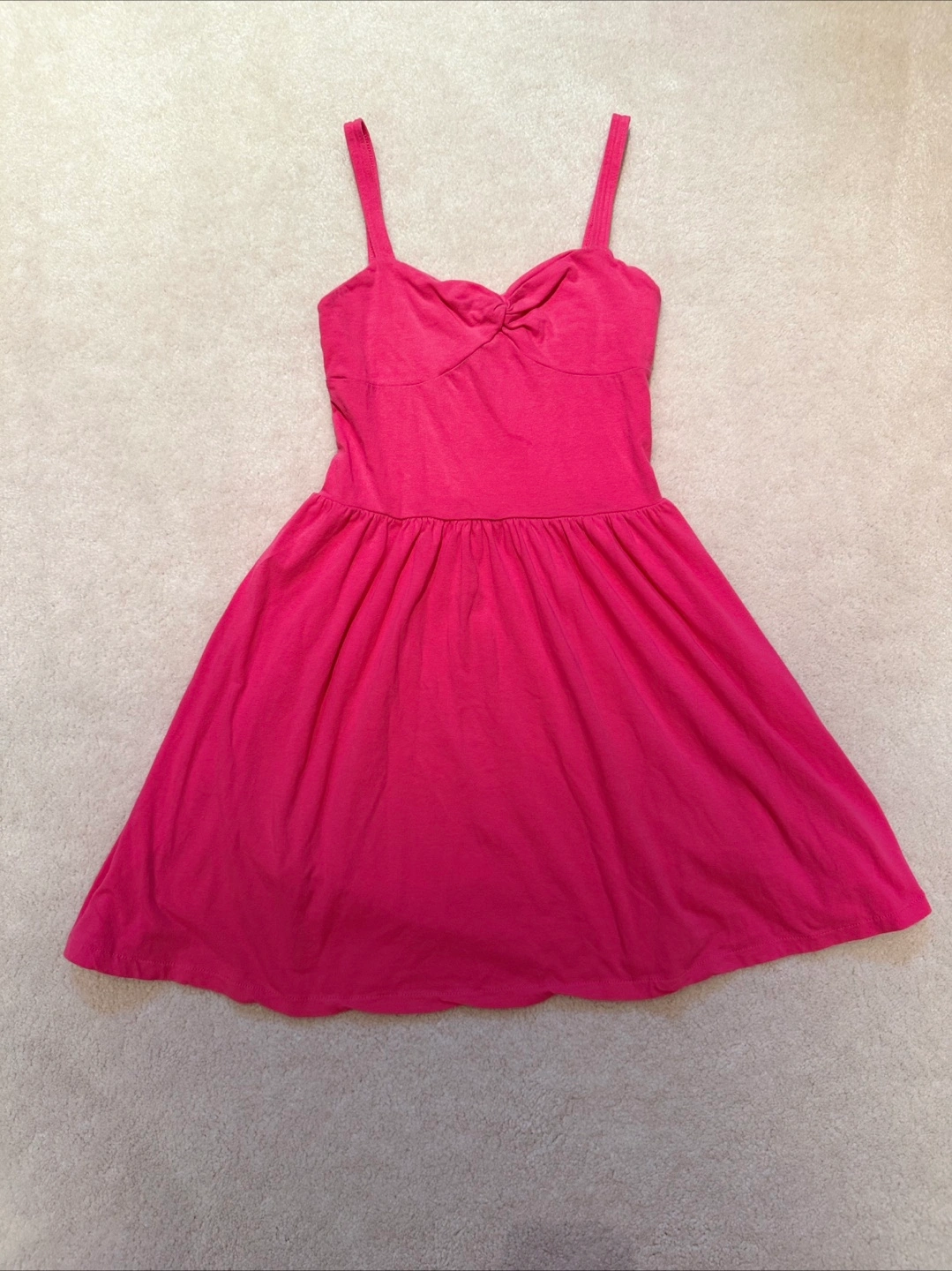 A cute pink sundress! It's in great condition and perfect for summer days. The dress has a fitted bodice and a flared skirt, making it super flattering and comfy to wear. It's a simple and stylish piece.