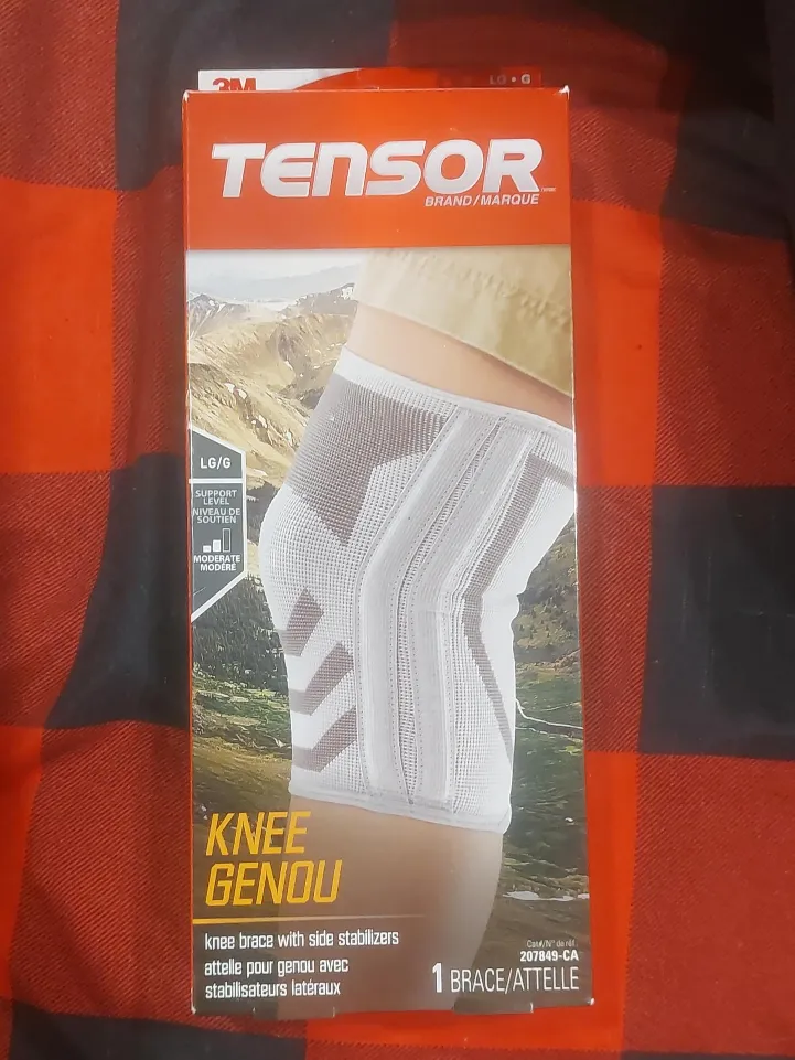 Selling a Tensor knee brace, size large. It offers moderate support and has side stabilizers. Perfect if you need a bit of extra support for your knee!