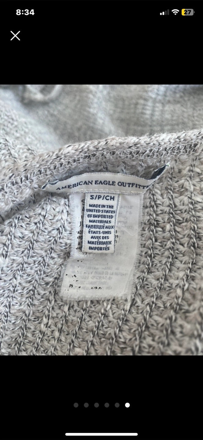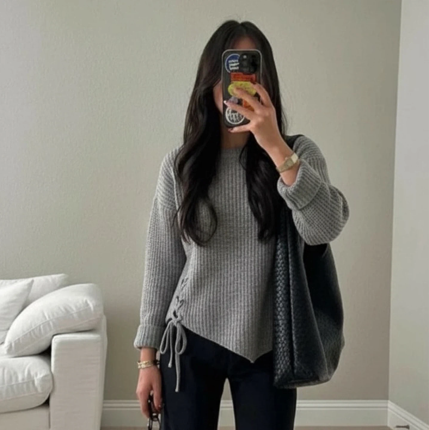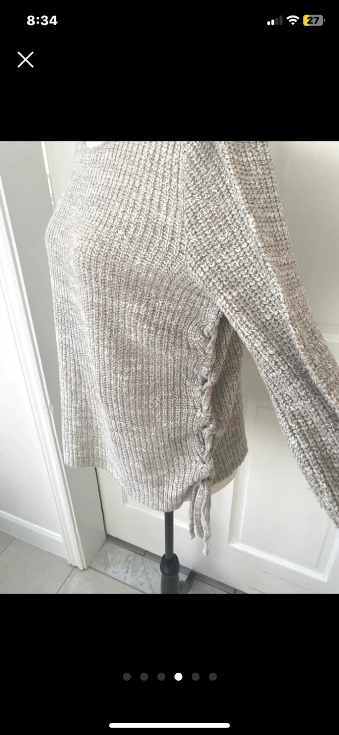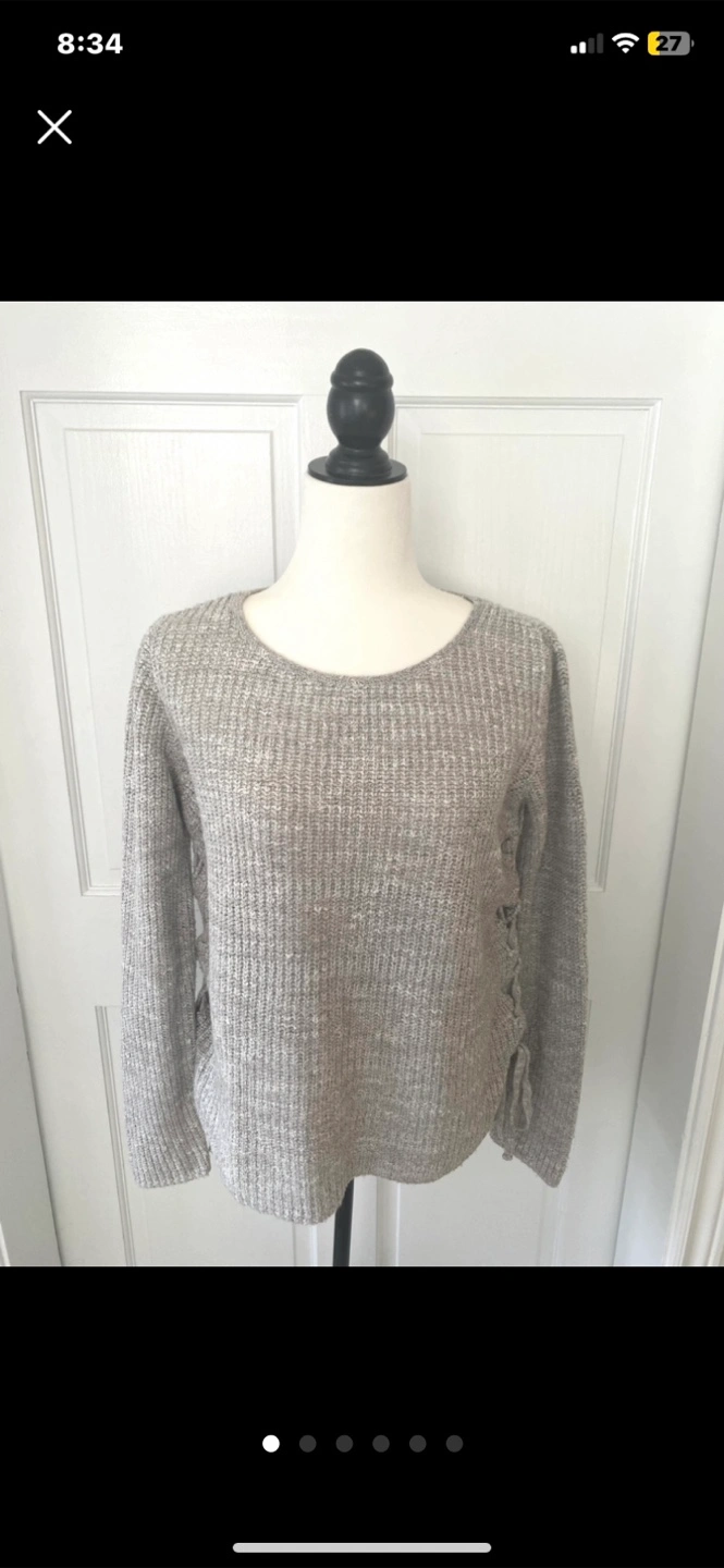 A cozy grey knit sweater with a unique lace-up detail on the side. It's in great condition and ready for a new home! Perfect for layering or wearing on its own during those cooler days. The material is soft and comfortable, making it a great addition to your wardrobe