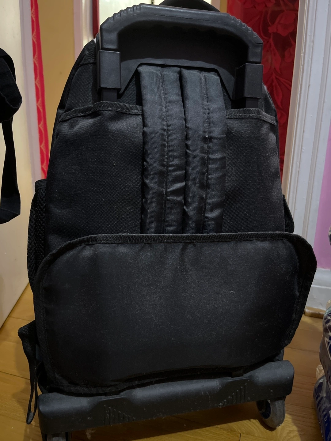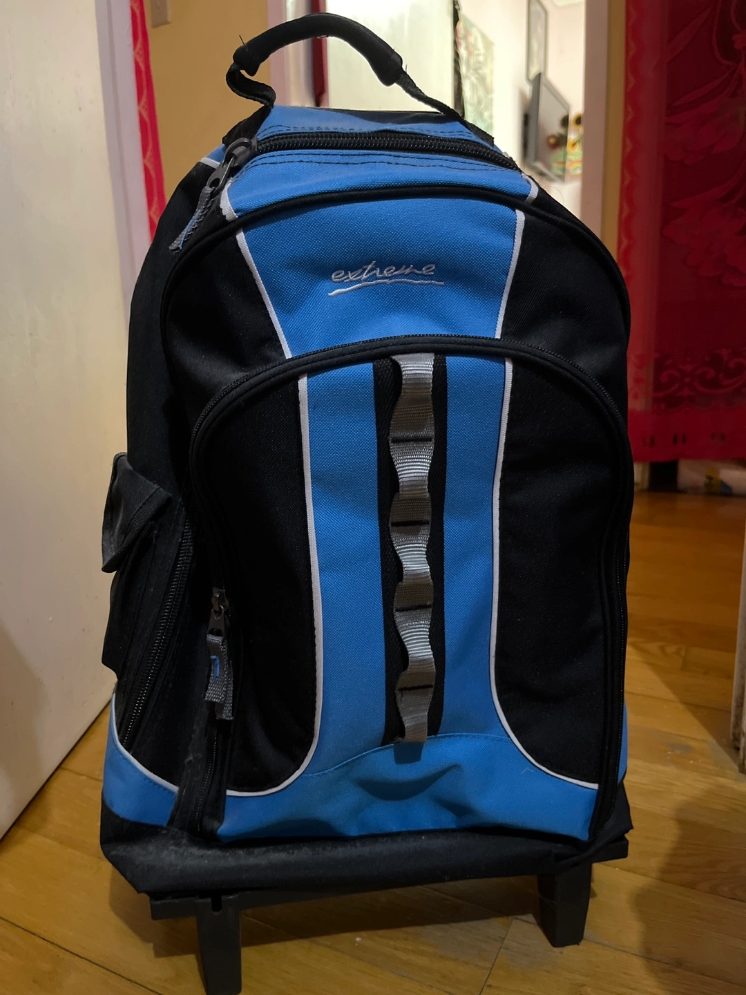 Selling a gently used wheeled backpack in black and blue. It's perfect for travel or school! It has a handle and wheels for easy transport, plus lots of pockets for storage. I used to use this rolling backpack when I wasn’t able to use my main backpack. No longer need it! It’s been sitting in my room unused so it’s gathering dust on the outside.