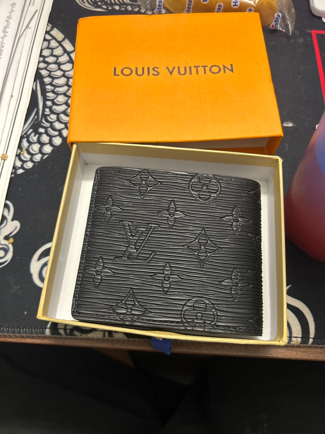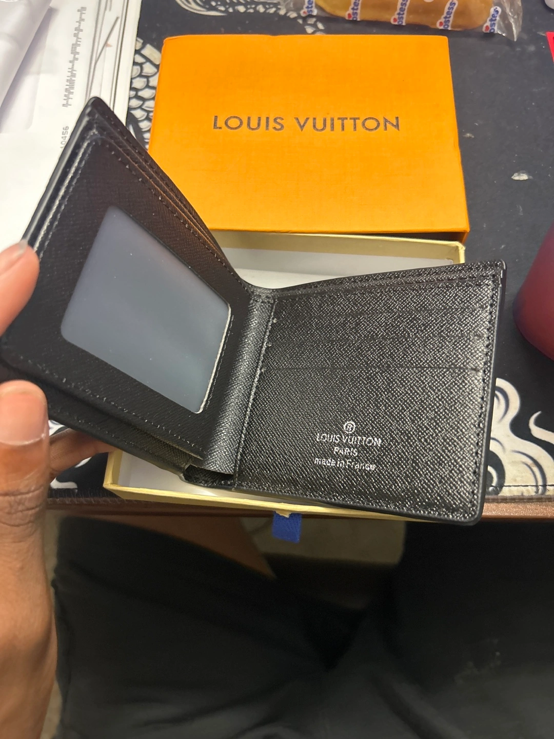 Selling a Louis Vuitton Epi Leather wallet in black. It's in great condition and comes with the original box. The wallet has a stylish design and is made in France. Perfect for everyday use!