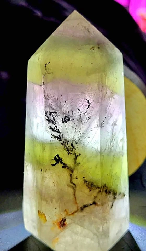 Incredibly rare, dendritic yellow and purple and clear Fluorite obelisk. This obelisk has many rainbow flashes throughout and It also has beautiful very pronounced dendrites. If you are a collector you don't want to pass this one up. They are very hard to find especially with very dark pronounced dendrites.