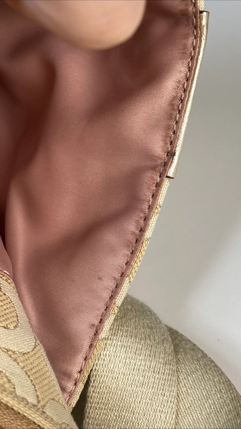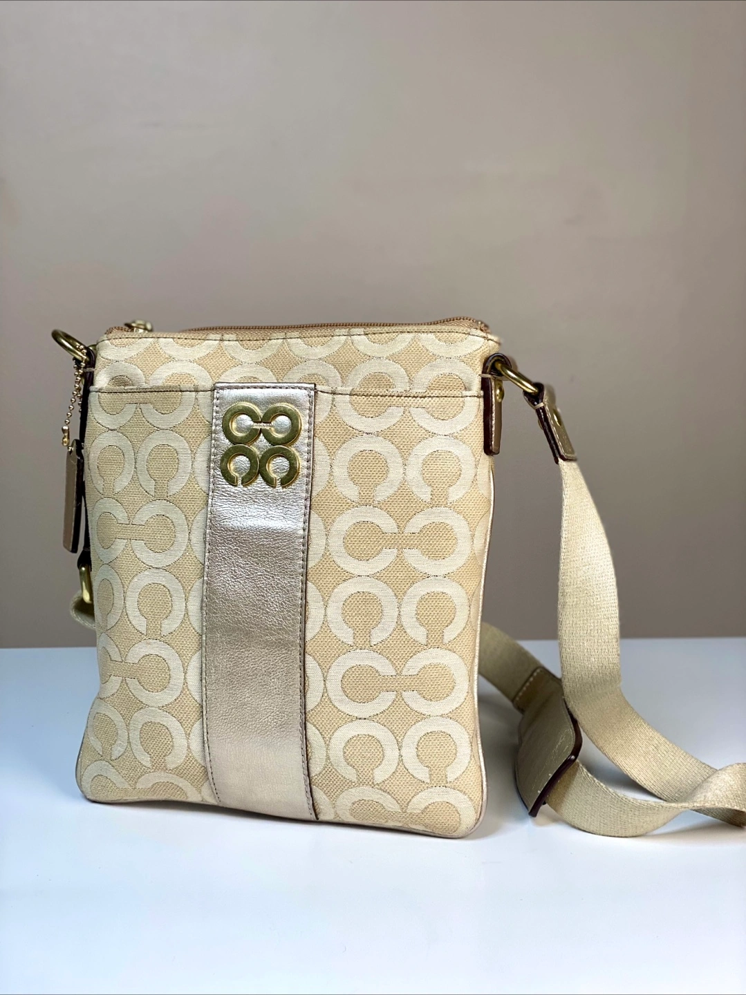 This is a Coach crossbody bag with a cream and gold colour scheme. It is in good condition and has a long adjustable strap. Perfect for everyday use!