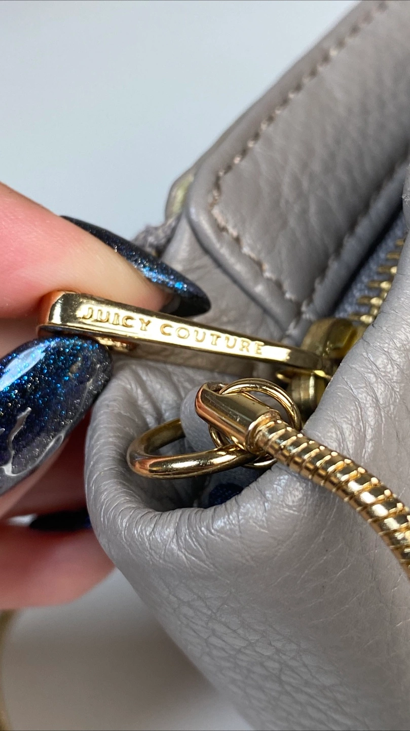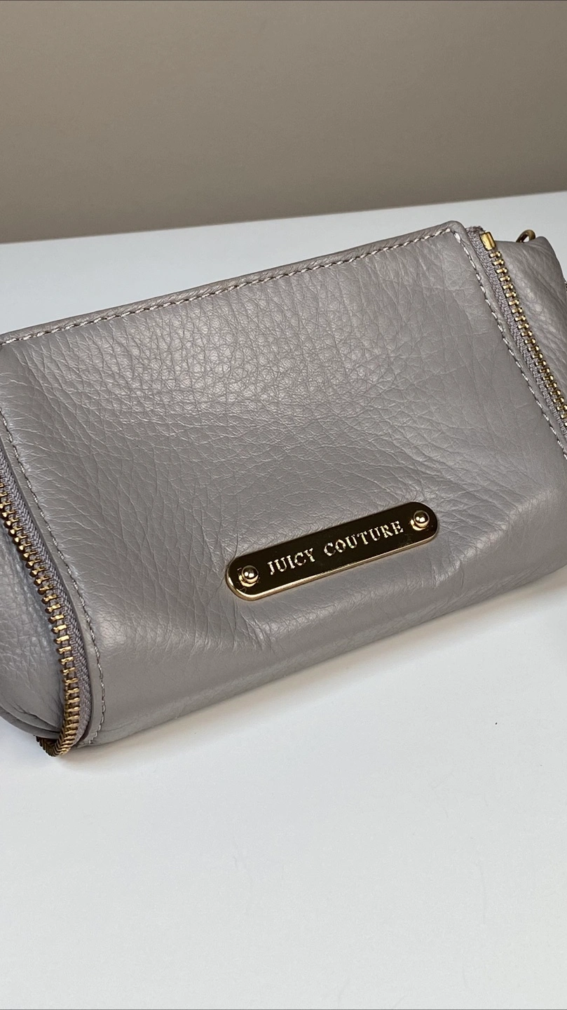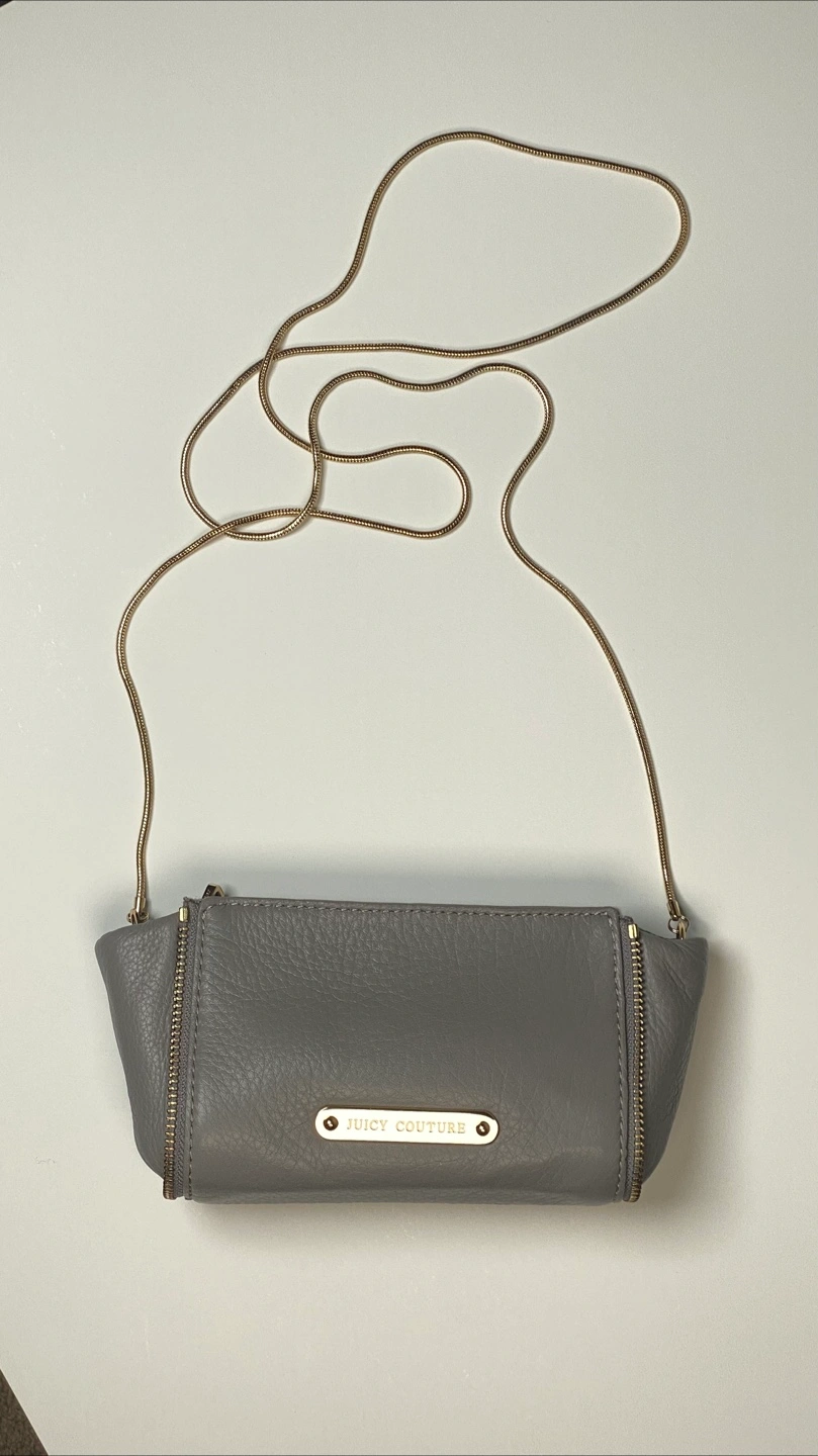 This is a cute Juicy Couture crossbody bag in a grey colour. It's made of leather and has a gold chain strap. It's in good used condition, with some wear and tear.