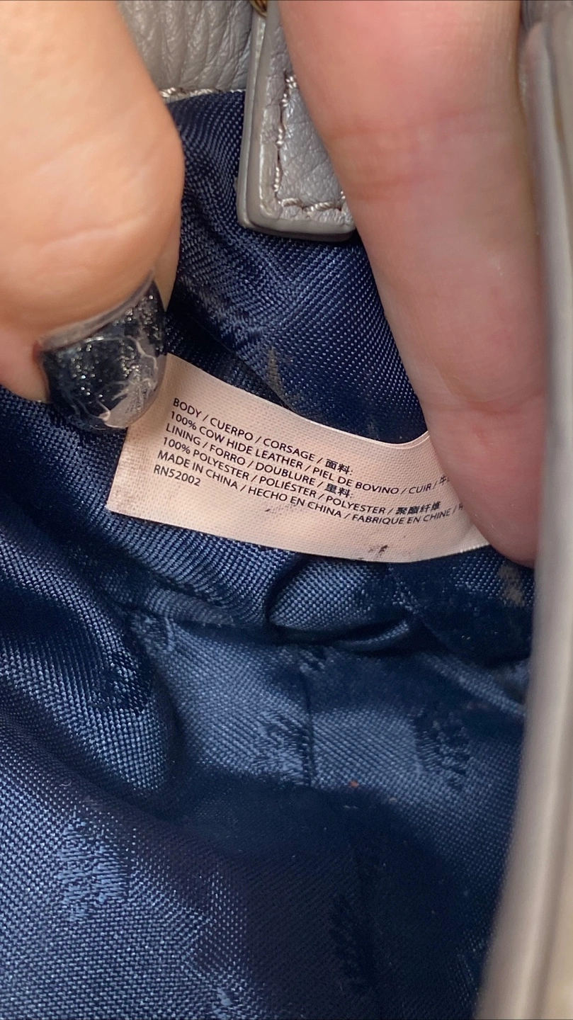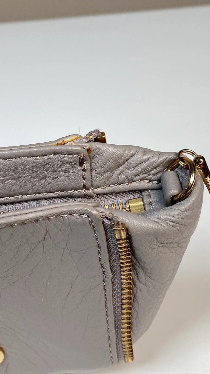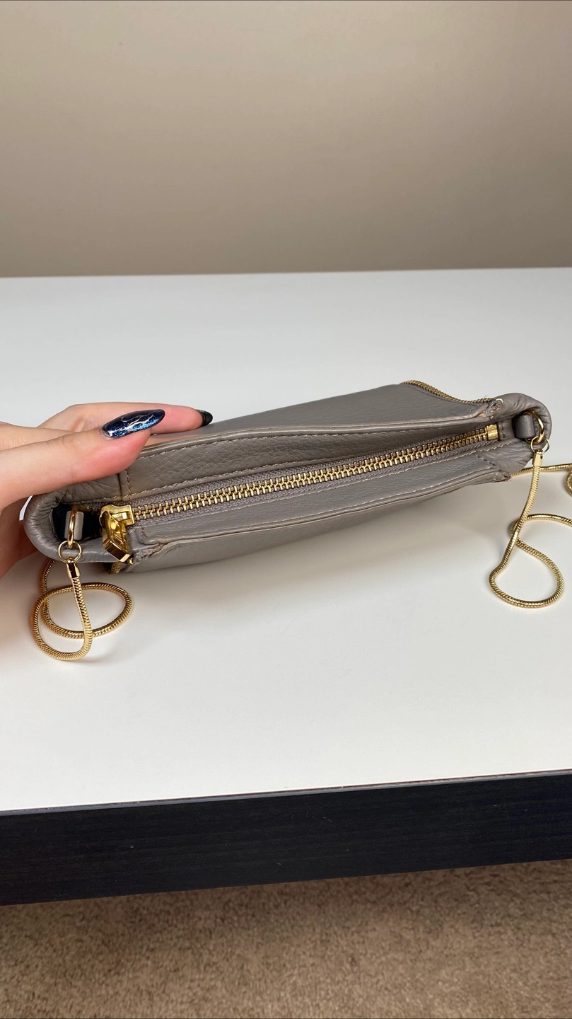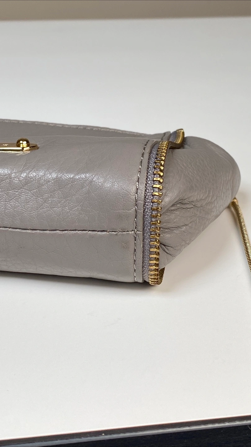 This is a cute Juicy Couture crossbody bag in a grey colour. It's made of leather and has a gold chain strap. It's in good used condition, with some wear and tear.