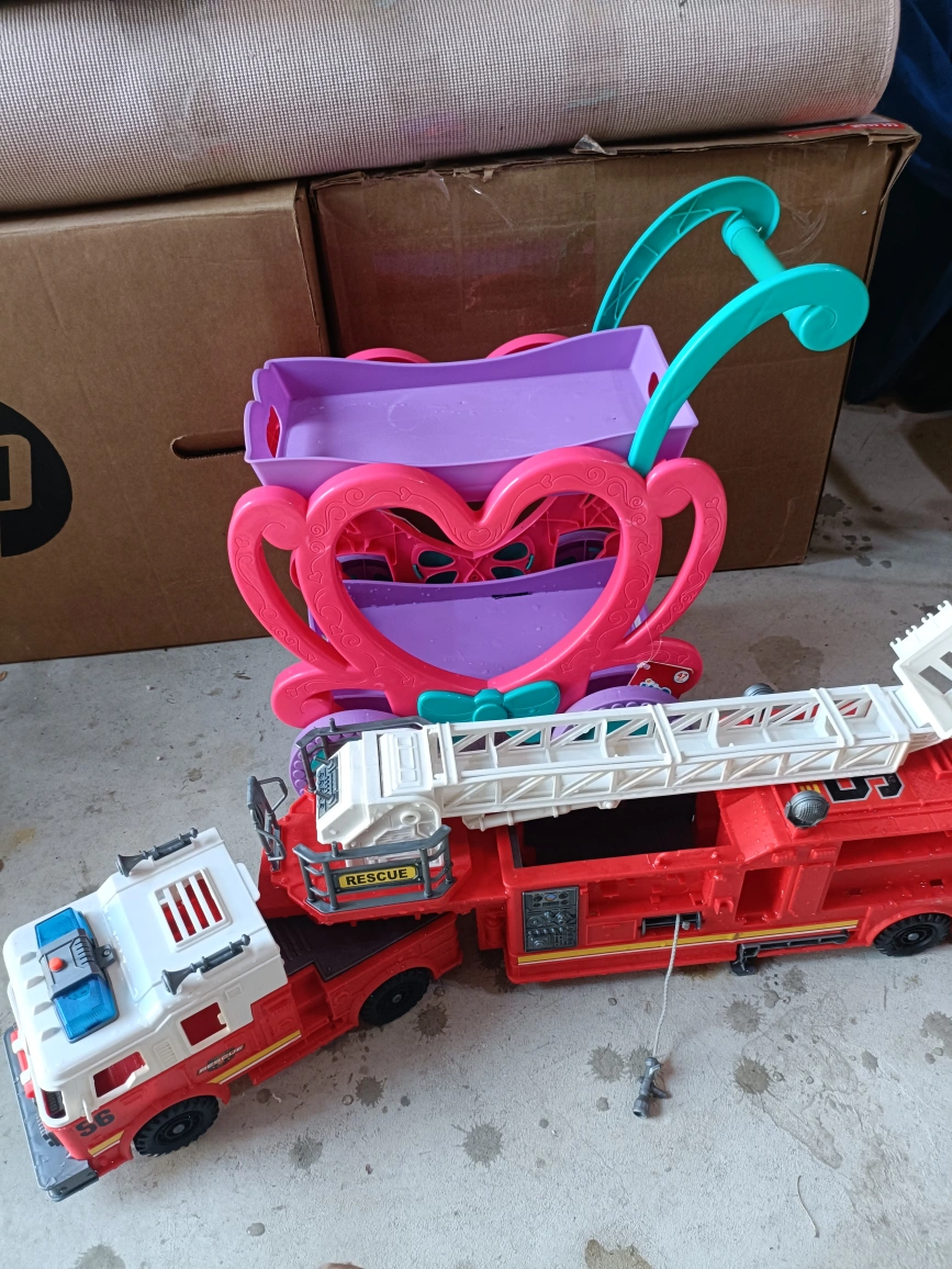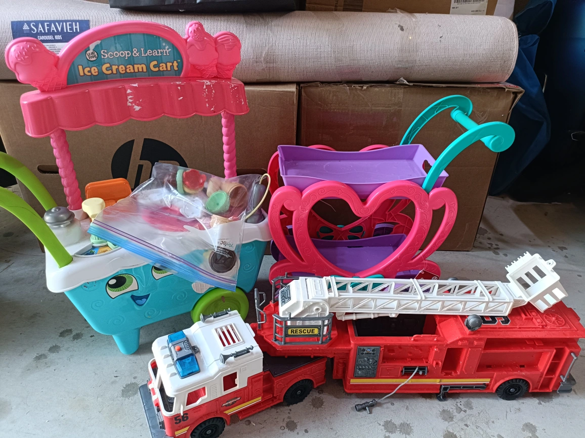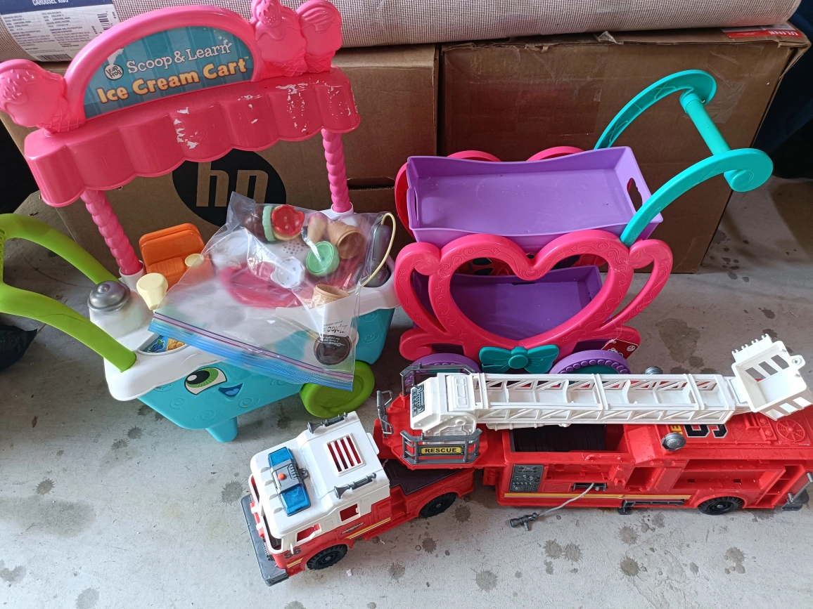 I'm selling a LeapFrog Scoop & Learn Ice Cream Cart. It's in great condition and ready for a new home! Perfect for toddlers to learn and play with. cart - $10 - Sold ice cream truck - 35 fire brigade truck (almost 3feet) - 15