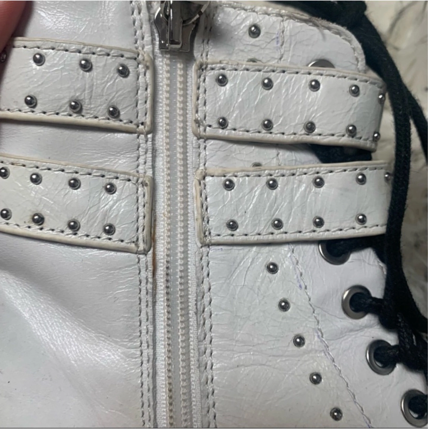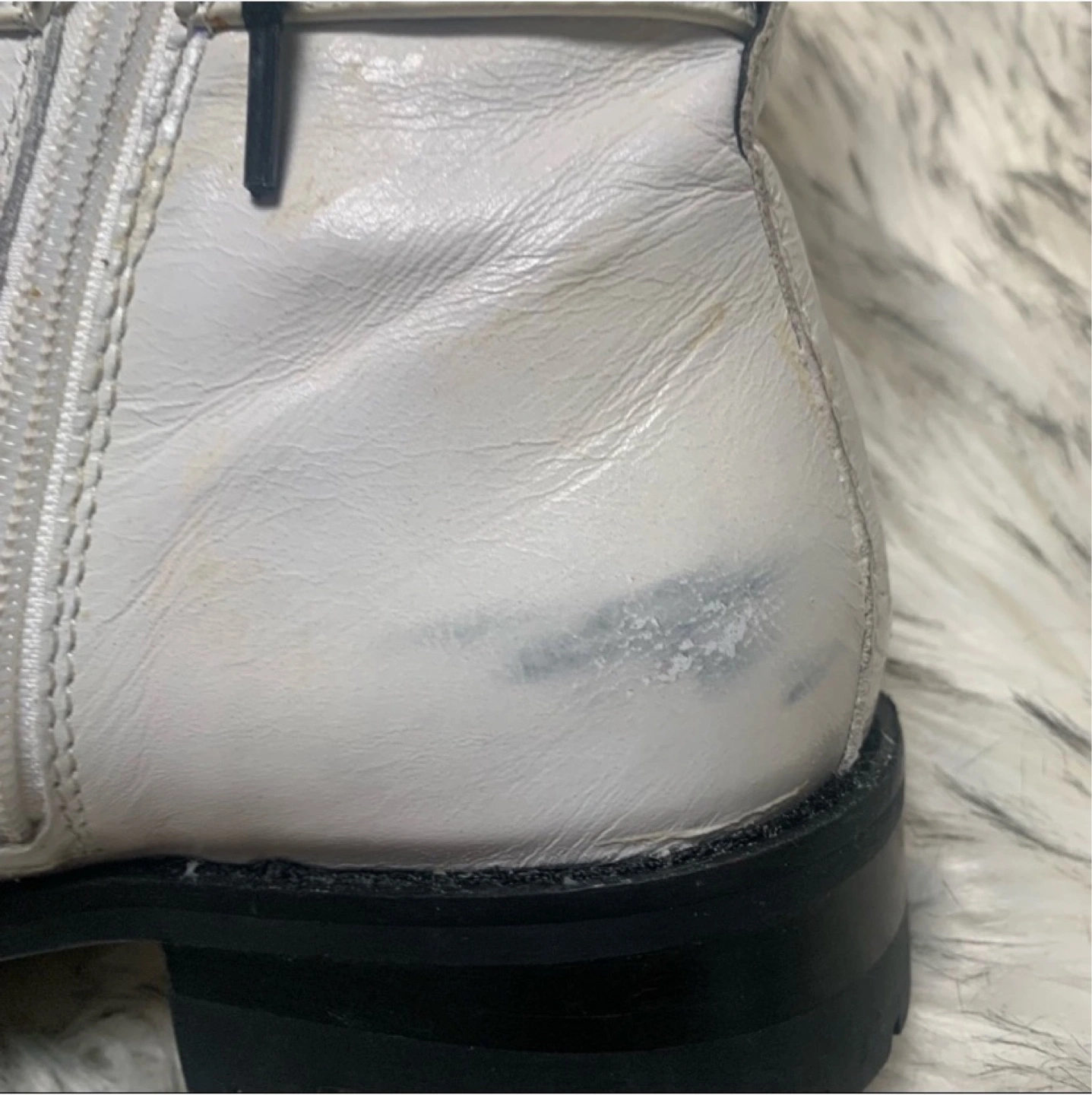 Flaws: faint yellowing throughout the leather (natural for white leather)