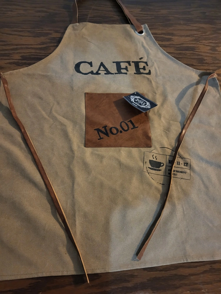 Selling a New w/tags, café apron from Attitude Import! It's a stylish apron with a 'Café' print and leather details. Perfect for adding a touch of charm to your kitchen or workspace
