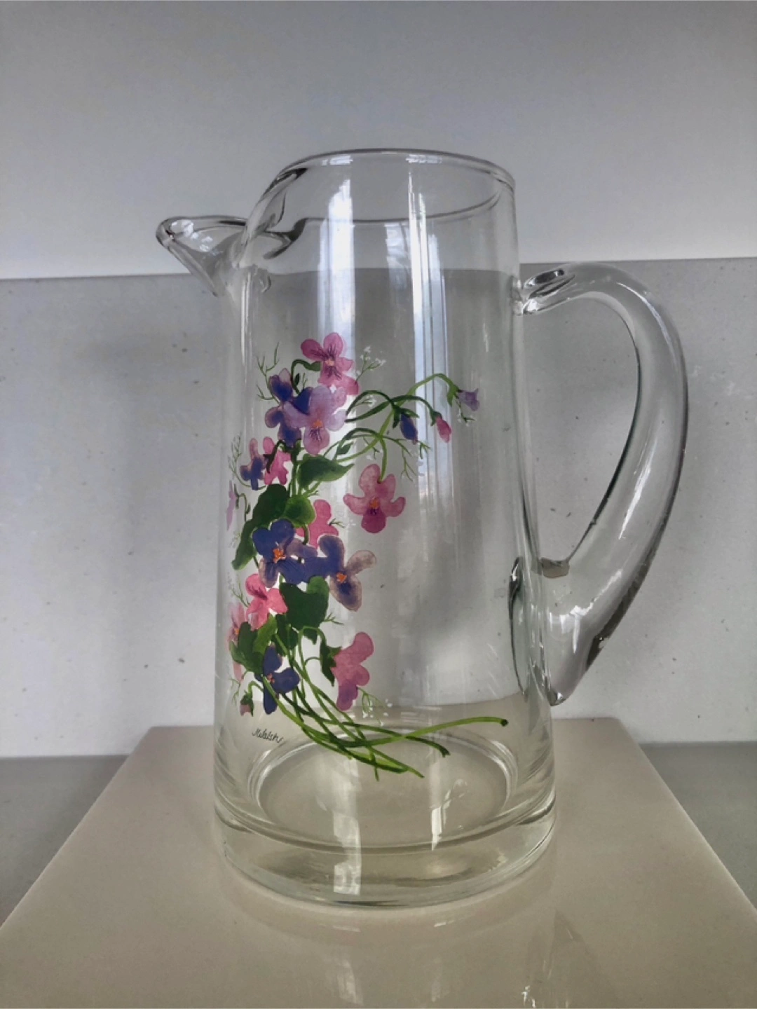 698This is a lovely clear glass pitcher featuring a delicate floral design by J. Walsh. It's in great condition and would be a beautiful addition to any table setting. Likely from Avon