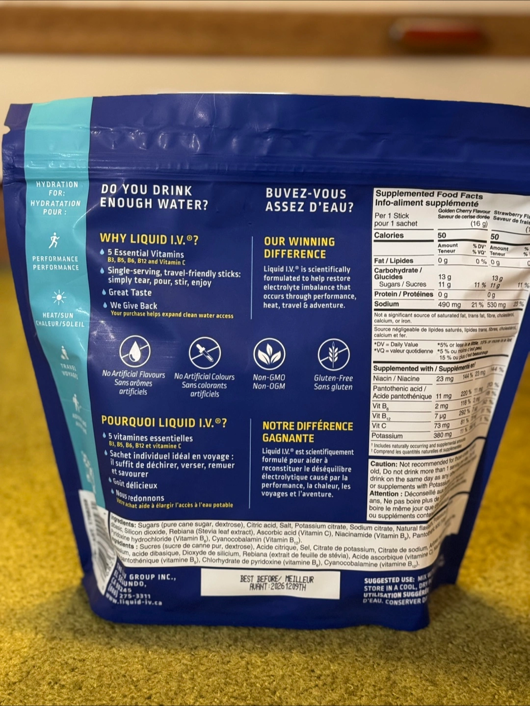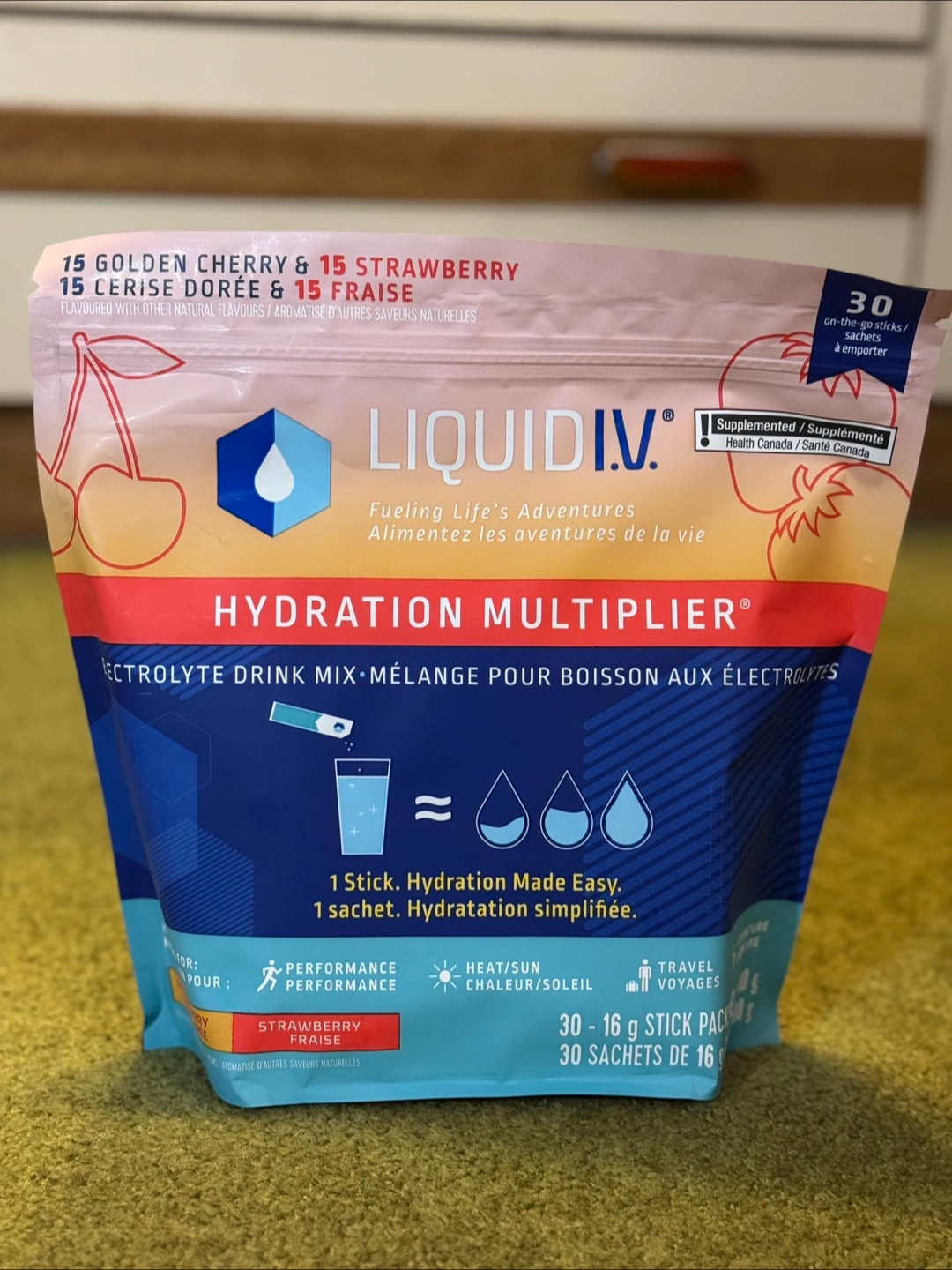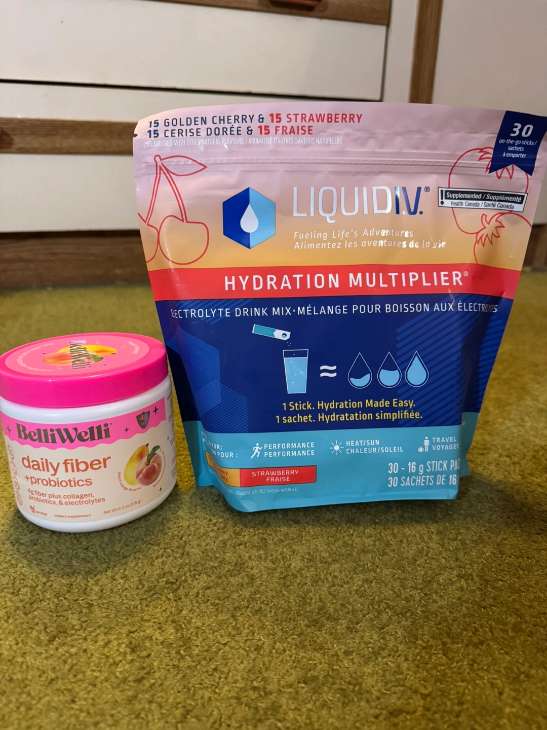 I have a BelliWelli Daily Fiber Probiotics supplement. It contains 4g fiber plus collagen, probiotics, and electrolytes. Also included is Liquid I.V. Hydration Multiplier Electrolyte Drink Mix. It contains 30 on-the-go sticks. Strawberry & Golden Cherry Flavour.