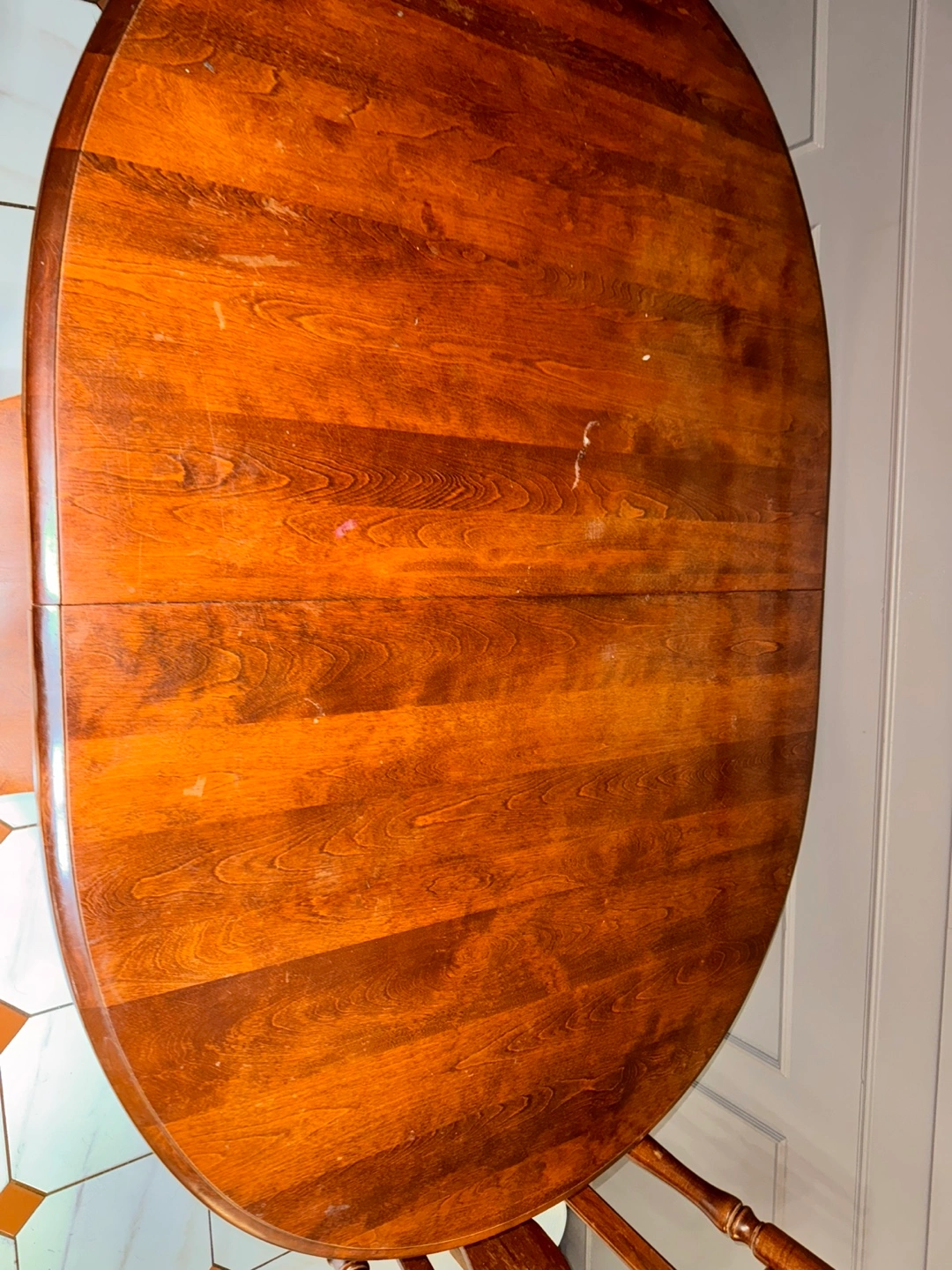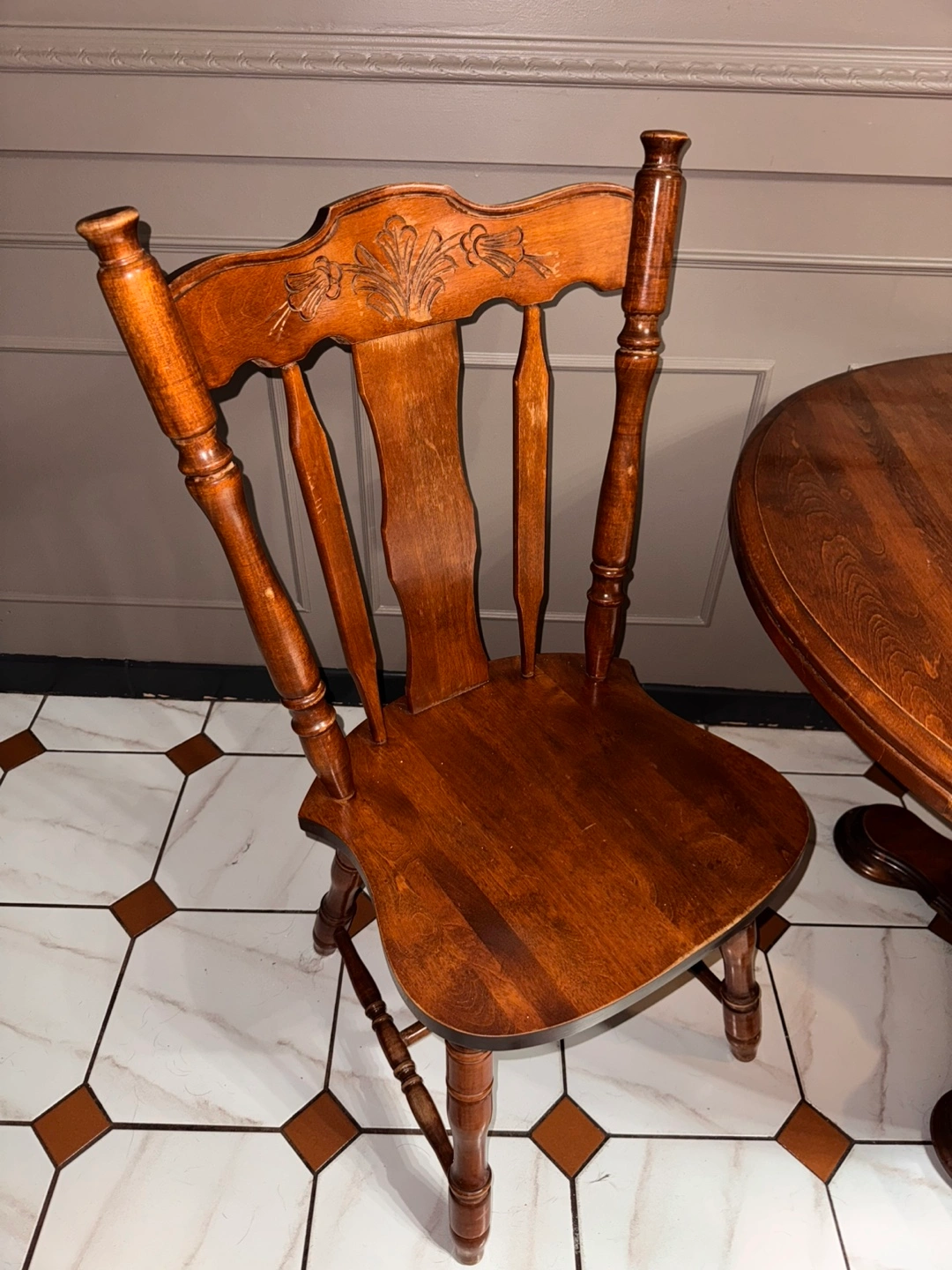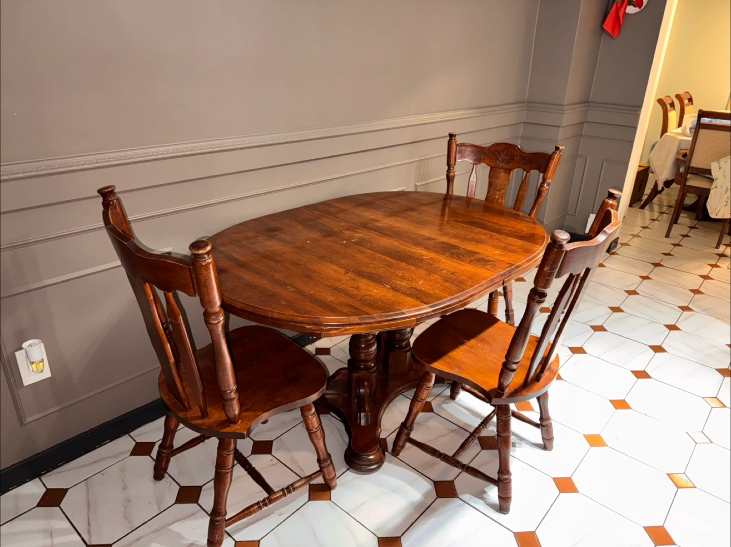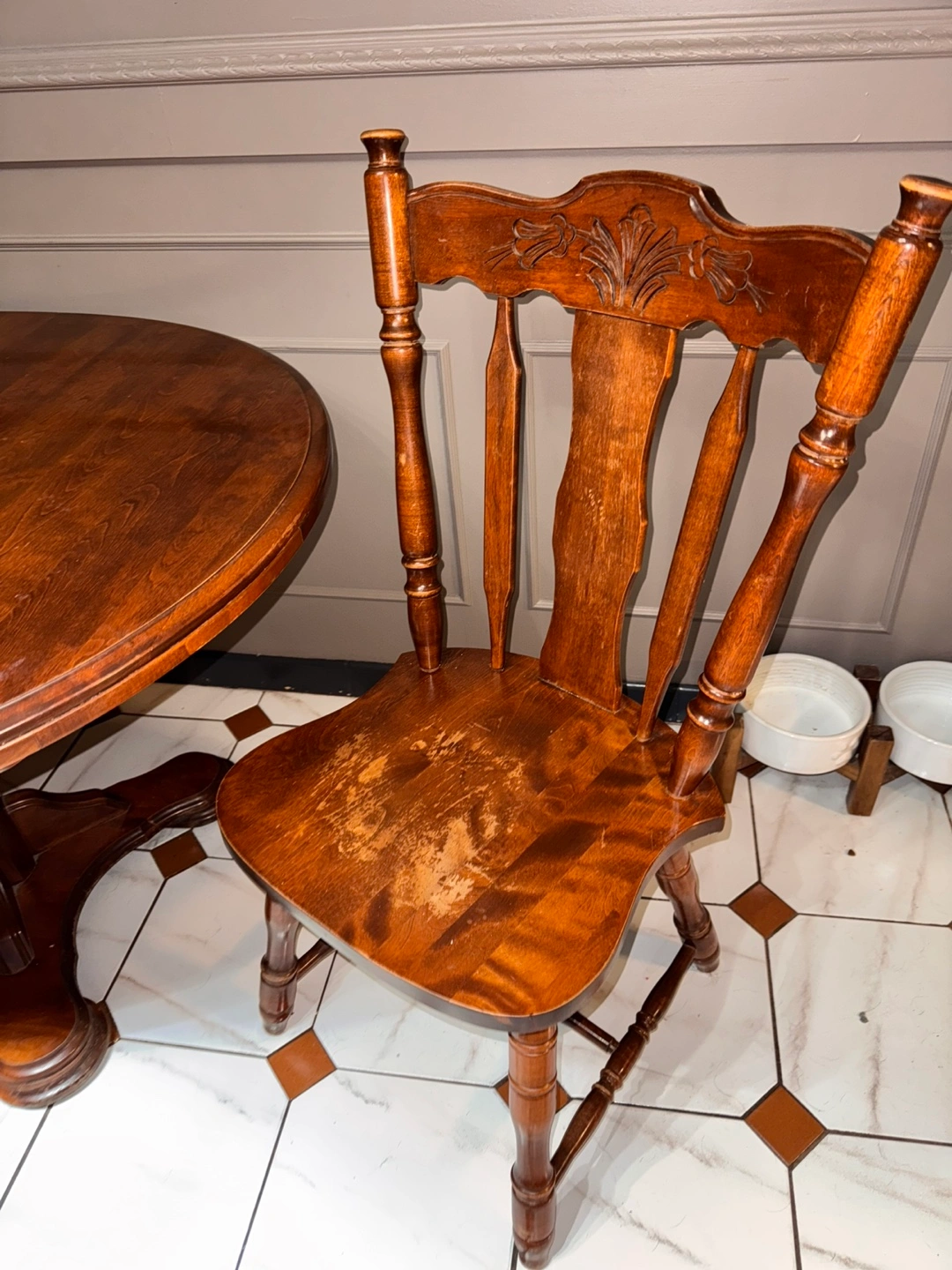 Selling a wooden dining table with four matching chairs. The set has some wear and tear, as seen in the pictures, but it's still sturdy and has a lot of character. Perfect for a cozy dining space!