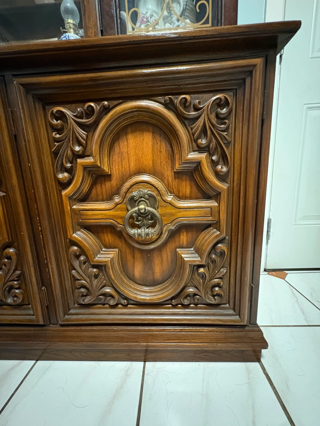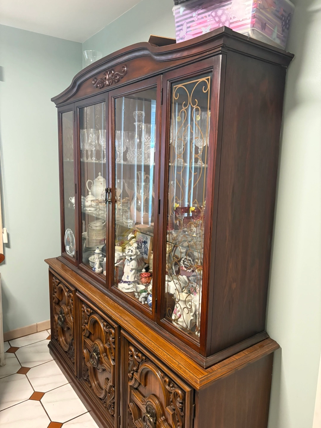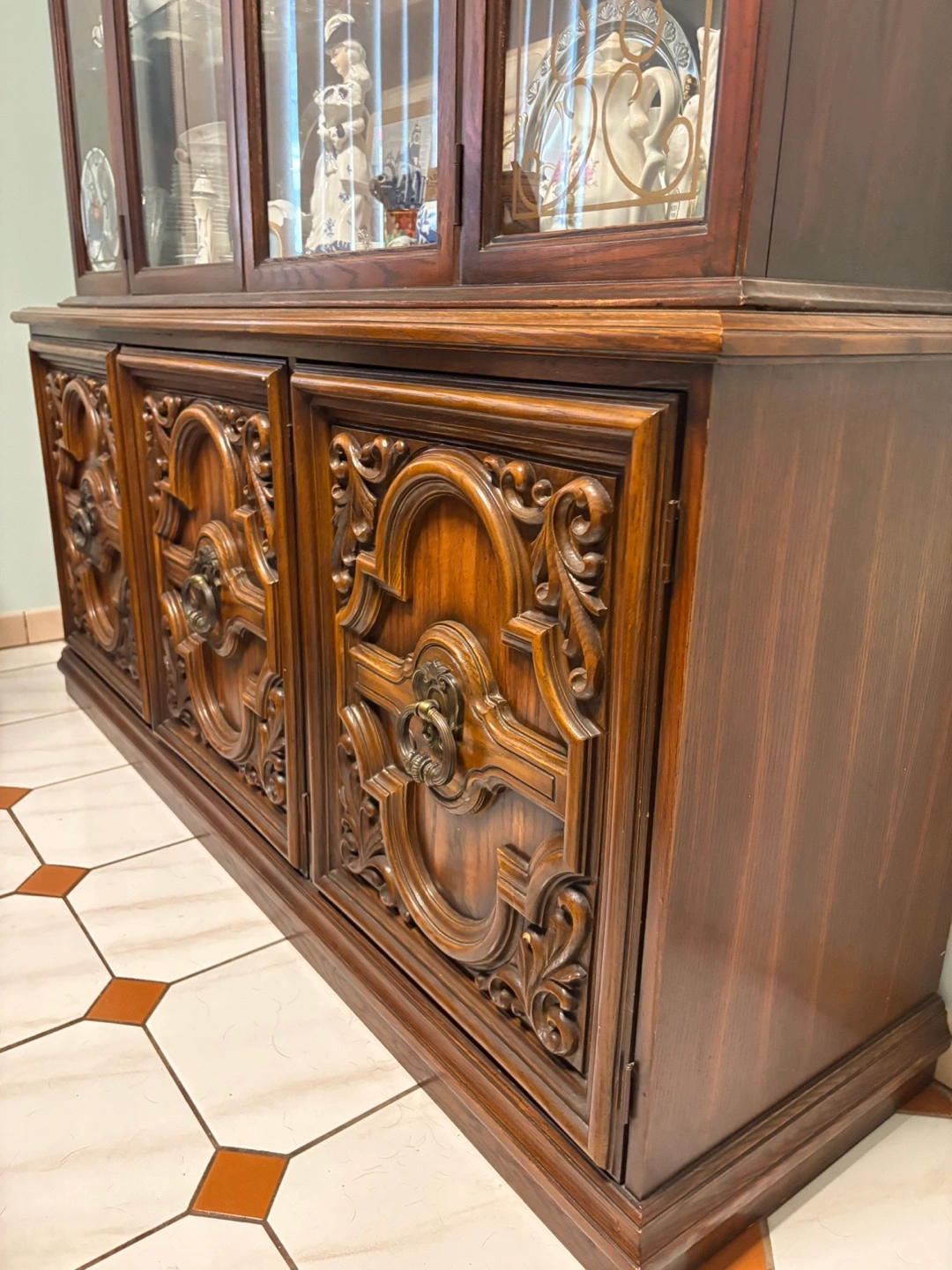 This is a beautiful antique china cabinet with ornate wood detailing. It features glass doors on the upper section and solid wood doors on the lower section, providing ample storage and display space for your fine china and collectibles. A stunning piece to add character to any dining room or living space!