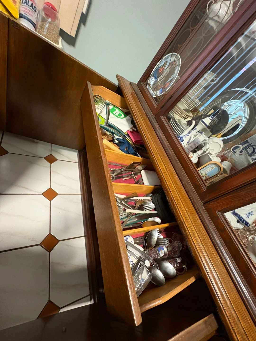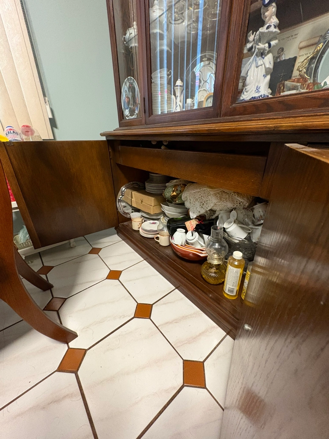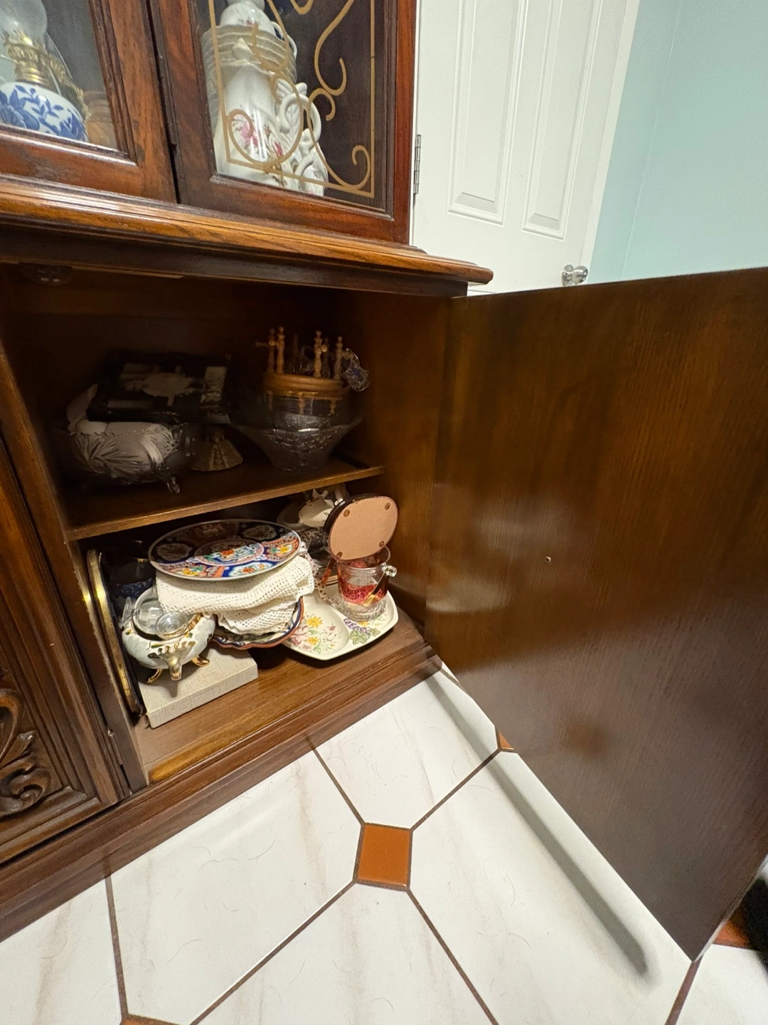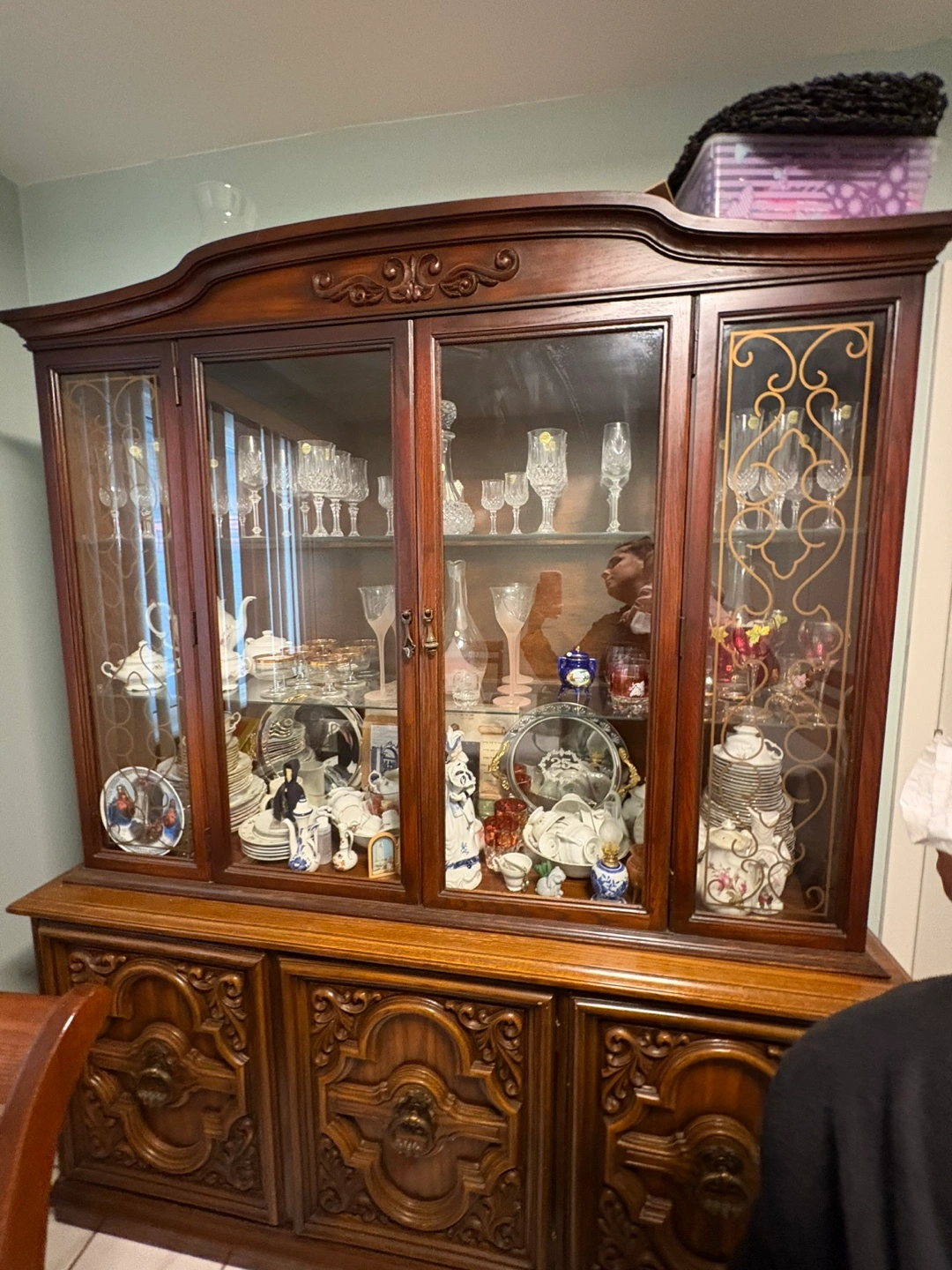 This is a beautiful antique china cabinet with ornate wood detailing. It features glass doors on the upper section and solid wood doors on the lower section, providing ample storage and display space for your fine china and collectibles. A stunning piece to add character to any dining room or living space!
