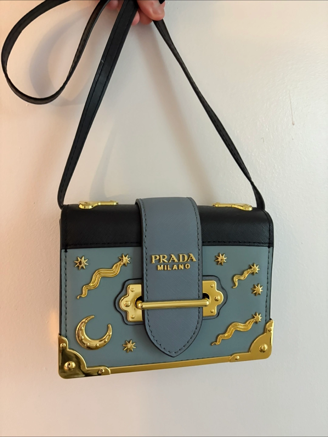 Selling a Prada Milano crossbody bag. It's in great condition and features a unique design with gold-tone hardware and celestial detailing. The bag has a black and grey colour scheme, making it a stylish accessory for any outfit