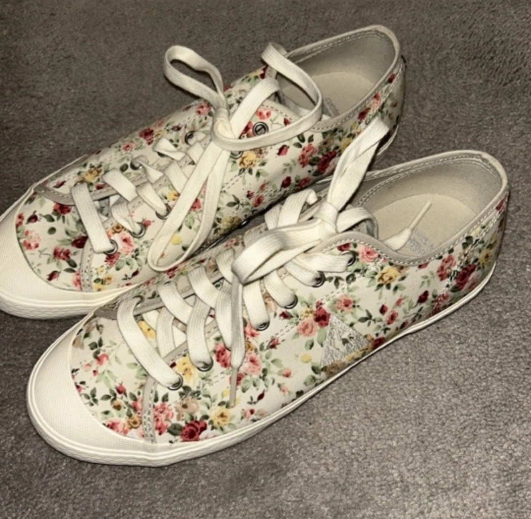 These Le Coq Sportif sneakers feature a lovely floral pattern. They're a women's size 7.5 (US). The shoes are in great shape and ready for a new home!