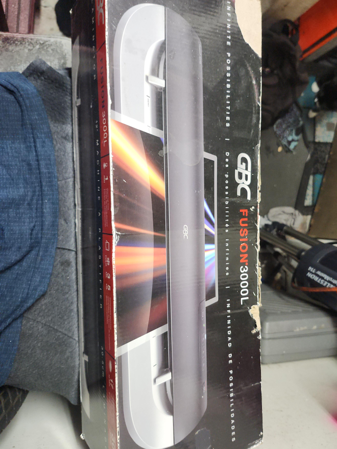 Selling a GBC Fusion 3000L 12" laminator in its original box! It's a 12" machine a plastifier. It has a warm up time of 1 minute and can handle 3-5 MIL. includes 15 pouches/5 mil. The box is included!