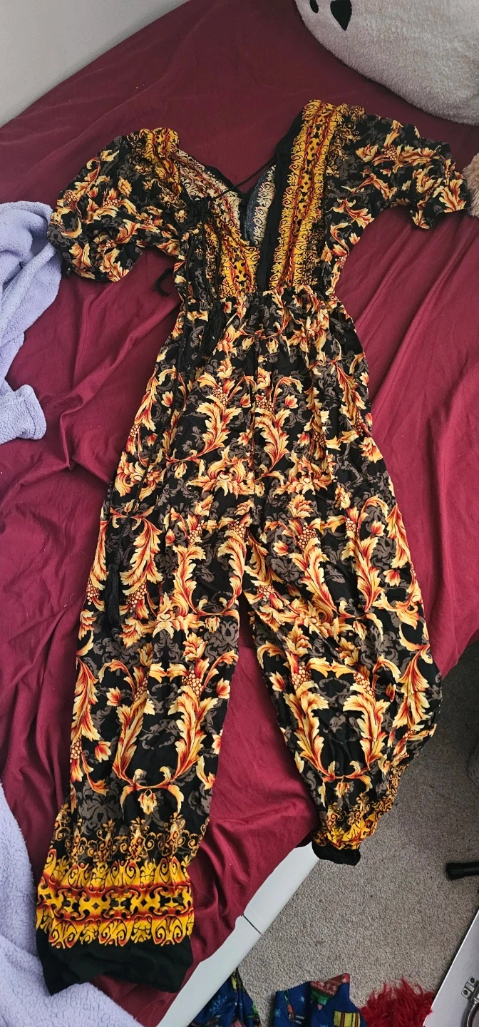 A flowy jumpsuit with a vibrant all-over print. It features a V-neckline and wide legs. The fabric is lightweight and comfortable.