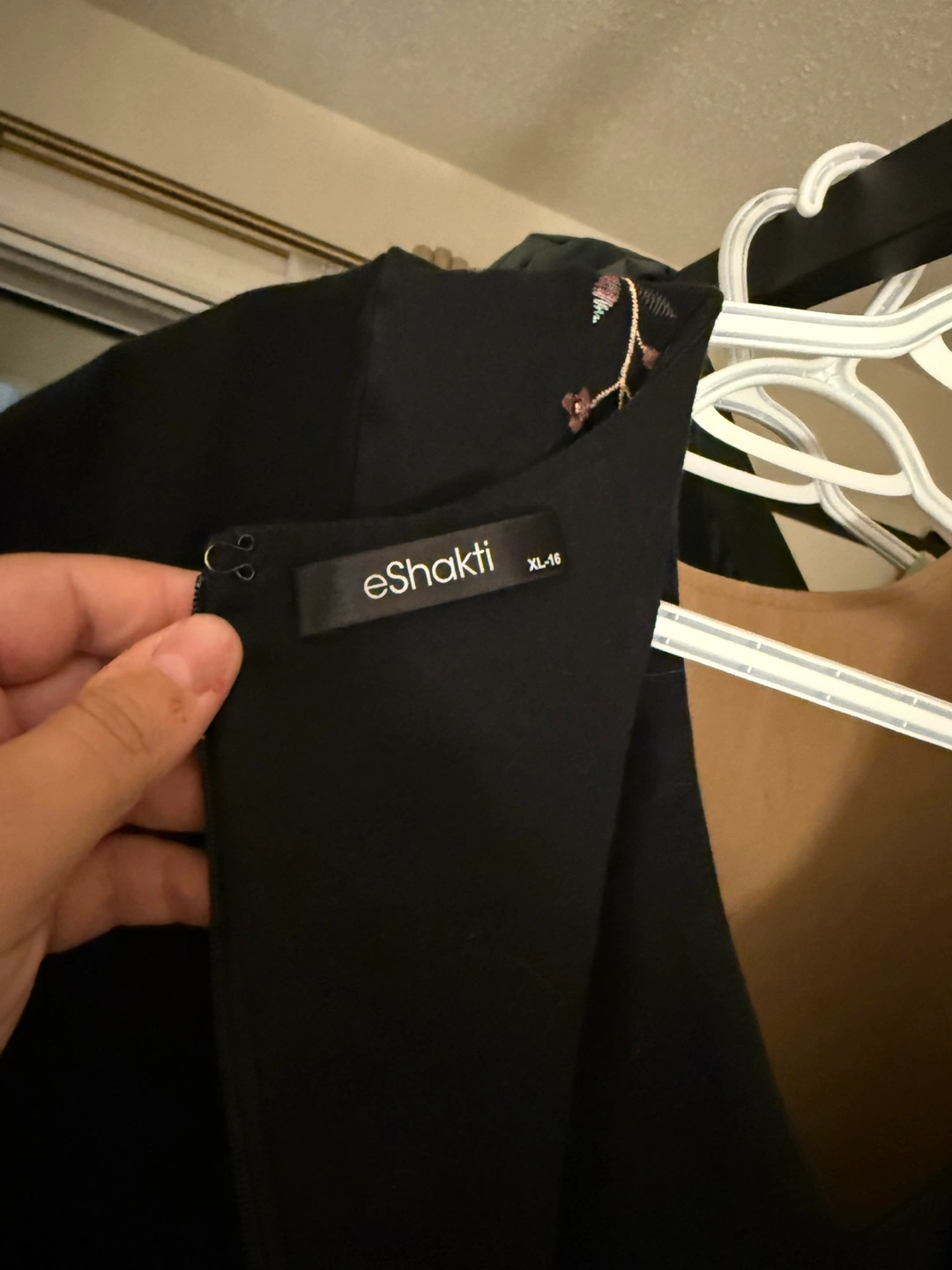Here's a lovely black dress from eShakti, size XL-16! It features beautiful floral embroidery on the bodice and short sleeves. It's in great condition and ready for a new home