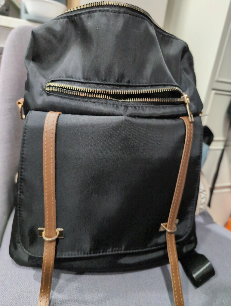 113This is a stylish black backpack with brown straps. It features a zippered top and a flap closure on the front pocket. It's in good condition and perfect for any students going back to school! It can also be used for work or casual outings.