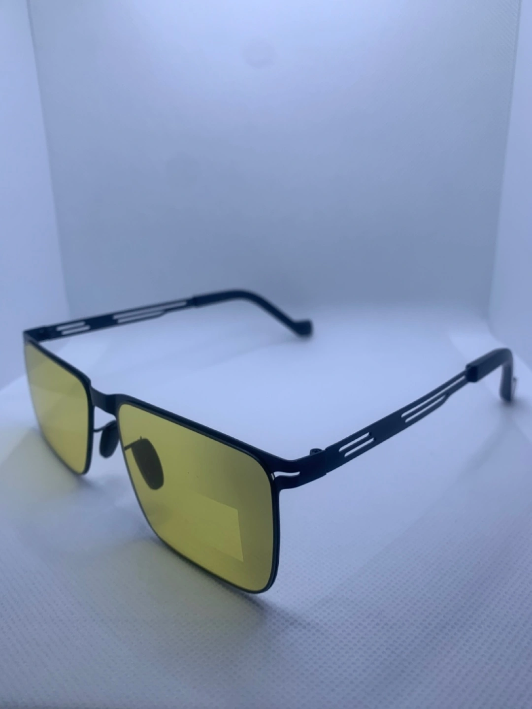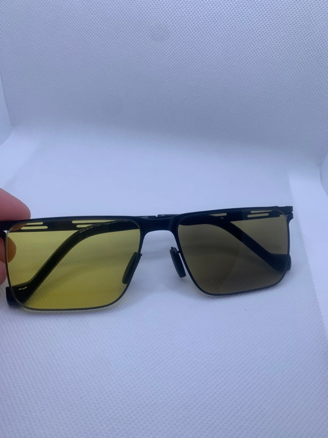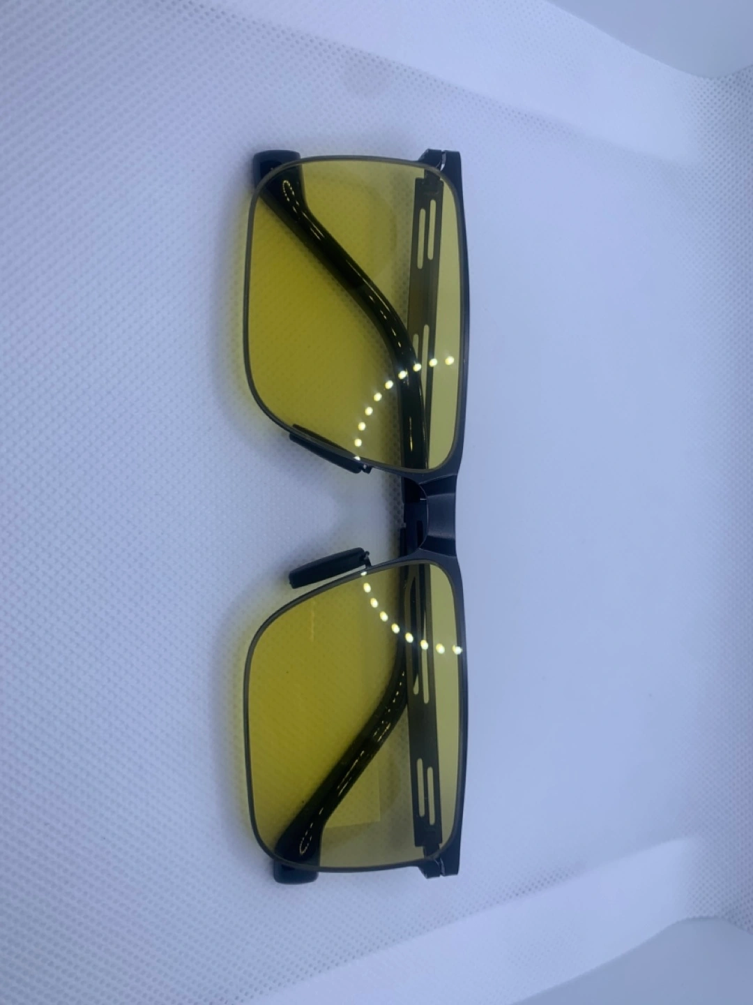 Selling a pair of sunglasses! They come with a case, a cleaning cloth, and a small tool for adjustments. The lenses are yellow, and the frames are black. Perfect for driving or any bright light situations!