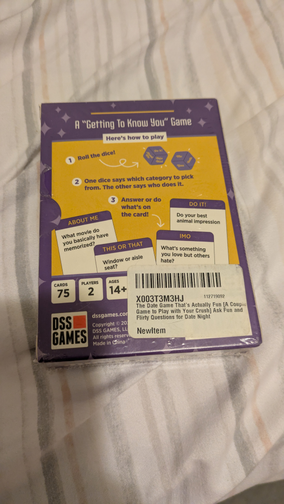 Selling a brand new, sealed copy of 'The Date Game: That's Actually Fun'! It's a "Getting To Know You" game perfect for 2 players, ages 14+. With 75 cards, it's sure to spark some fun and flirty questions for date night! This game is a great way to connect and have a laugh