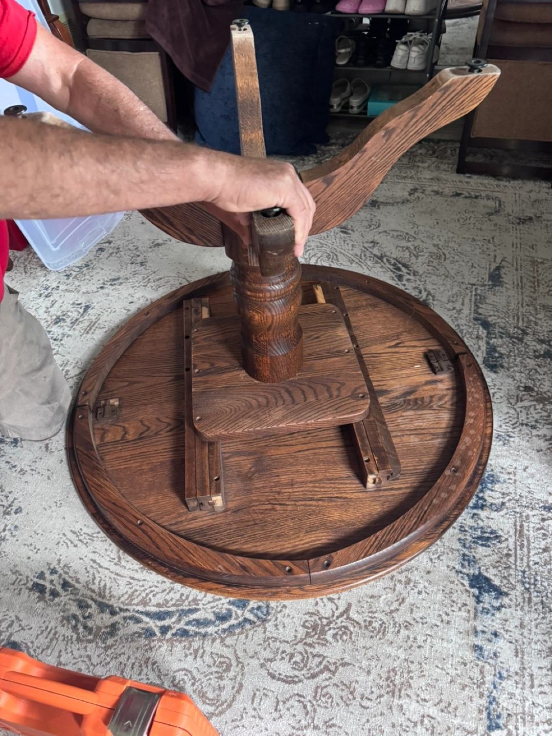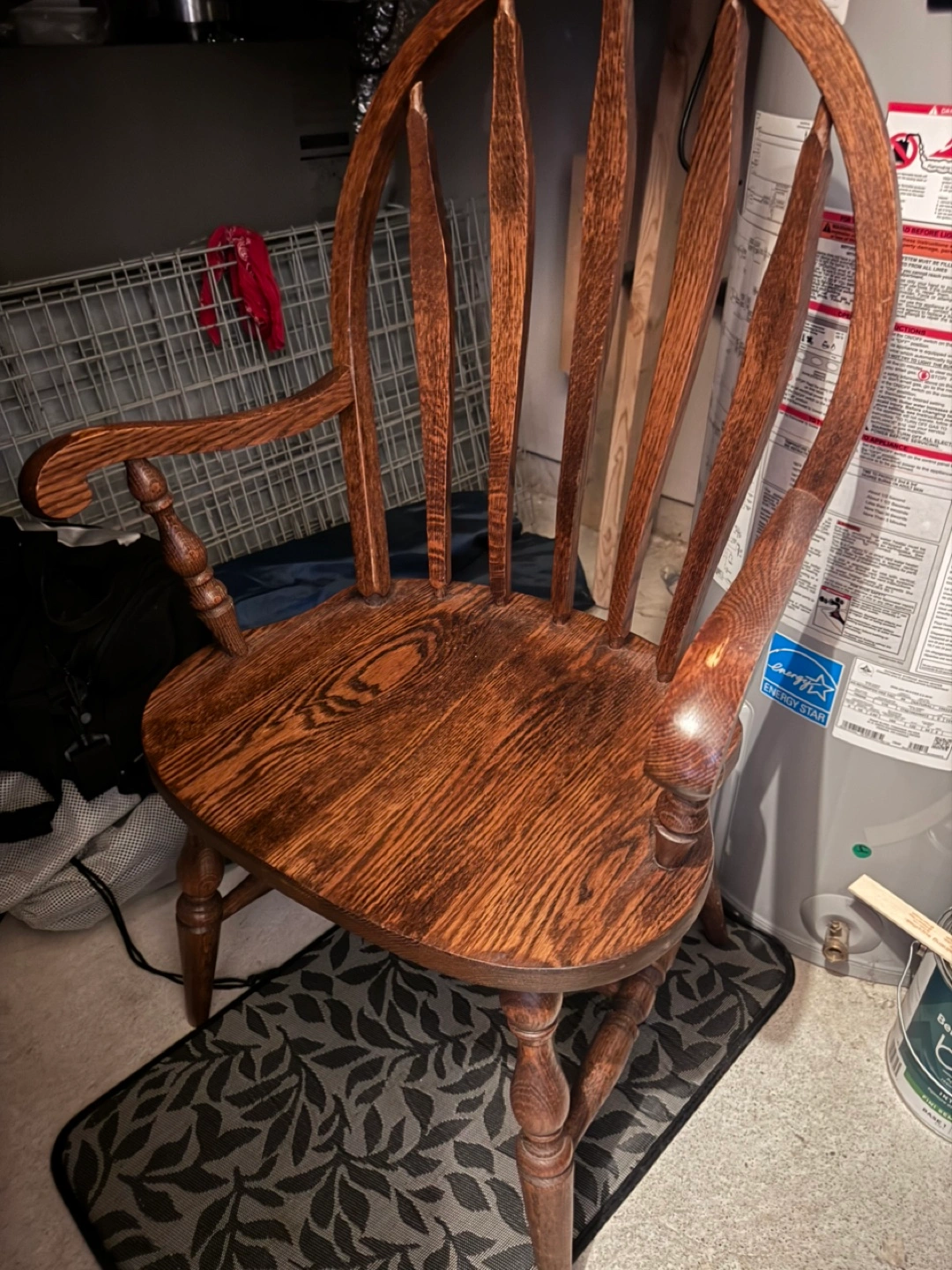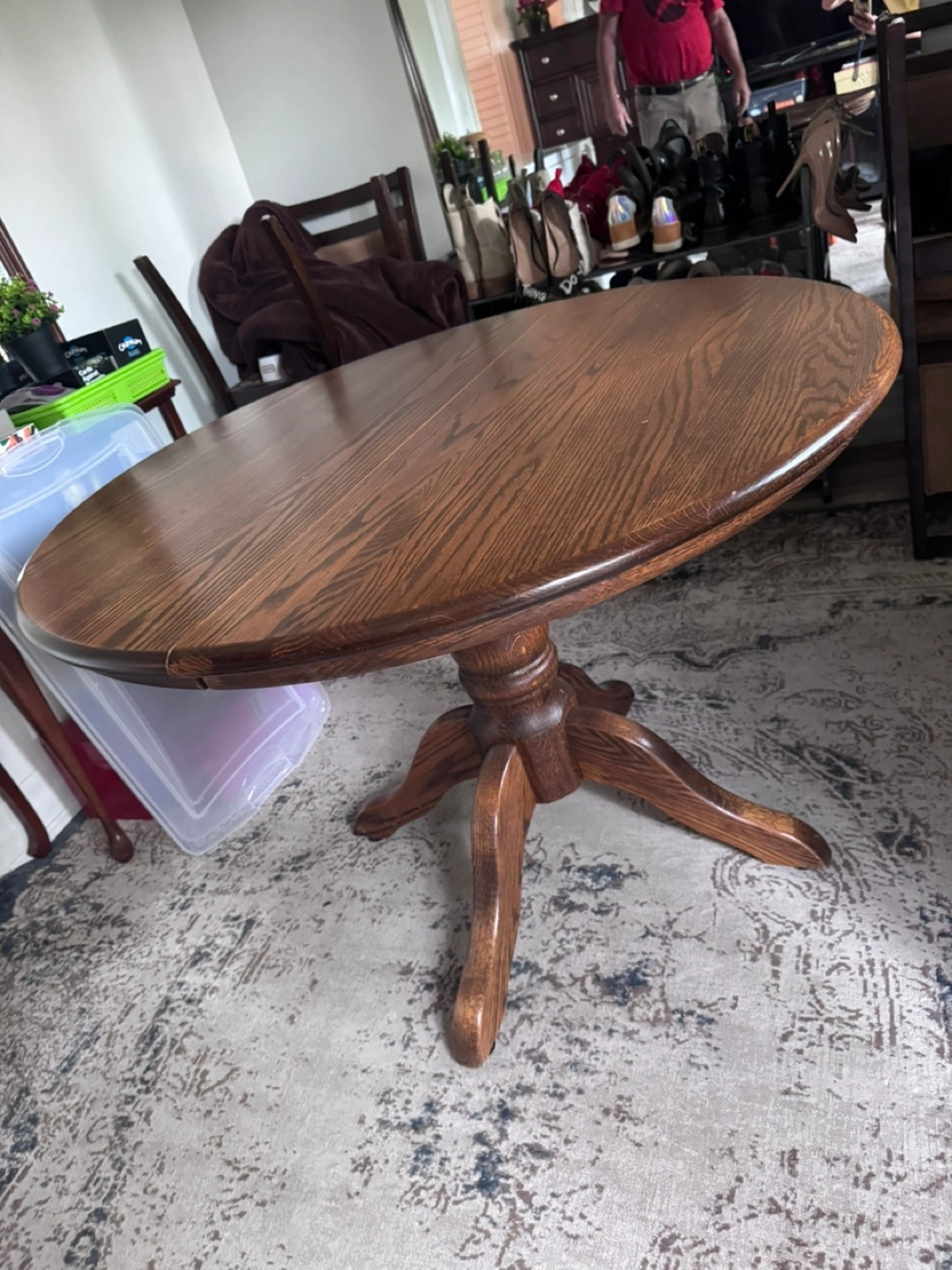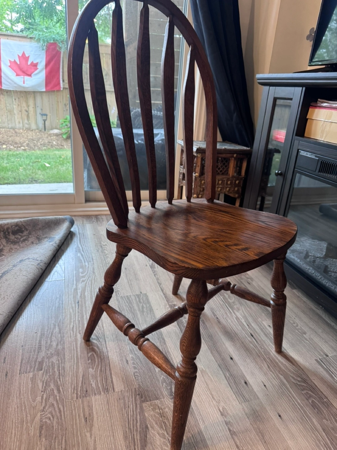 Selling a wooden spindle back 4 chairs and a round wooden table & two leafs included. Both pieces have a lovely, classic design and would be a great addition to any home. They have a warm, brown colour. (Maybe walnut or oak wood?)